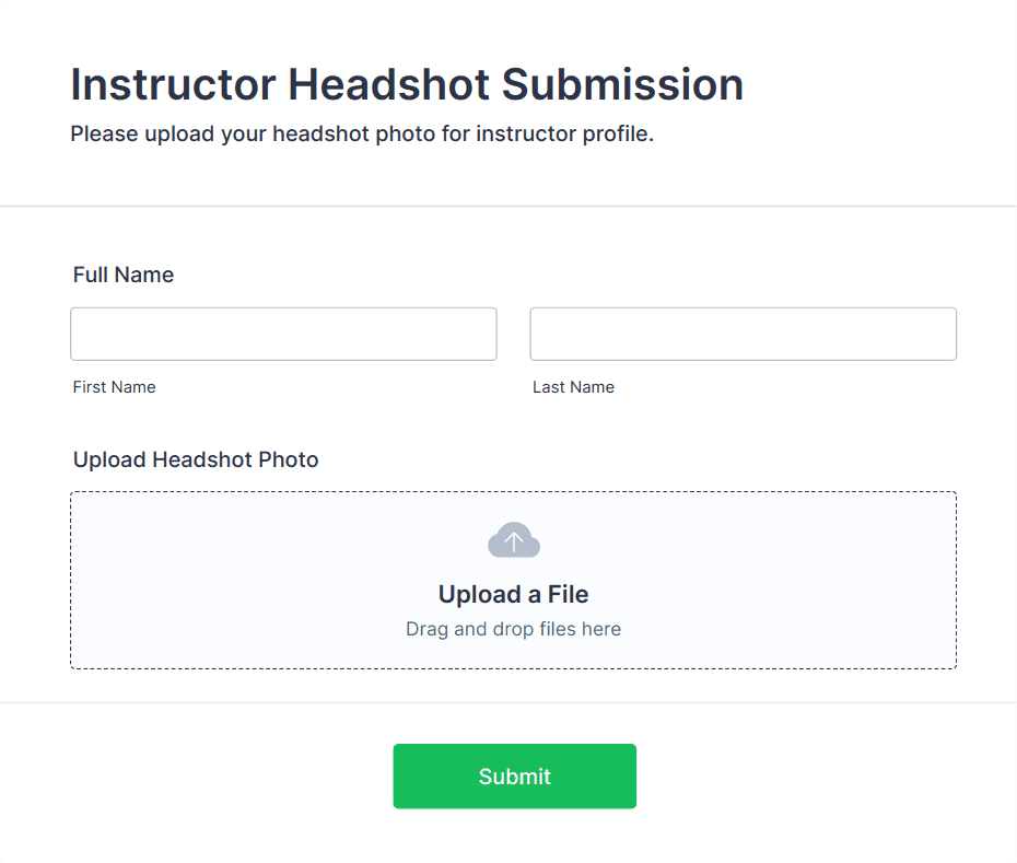 An Instructor Headshot Submission Form should include fields for the instructor’s name, role or title, department, contact information, photo upload, usage permissions or consent, and any notes about preferred photo credits or styling guidelines.
