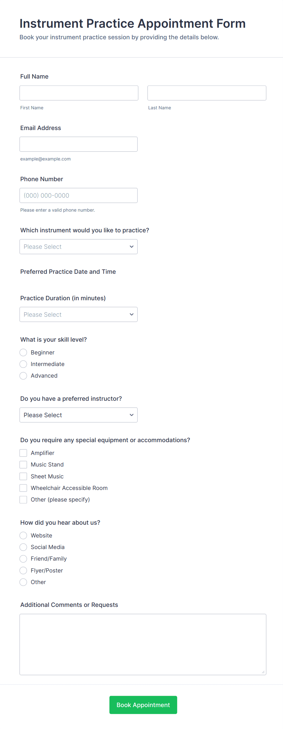 Appointment forms are digital tools designed to streamline the process of scheduling meetings, consultations, interviews, or any type of appointment between service providers and clients. These forms are commonly used by healthcare professionals, salons, educational institutions, consultants, and businesses that require organized time management for their services. By collecting essential information such as preferred dates, times, contact details, and specific service requests, appointment forms help reduce scheduling conflicts, minimize no-shows, and improve overall efficiency. Whether you’re managing a busy clinic, coordinating interviews, or booking personal training sessions, appointment forms provide a structured way to handle bookings and keep your calendar organized.