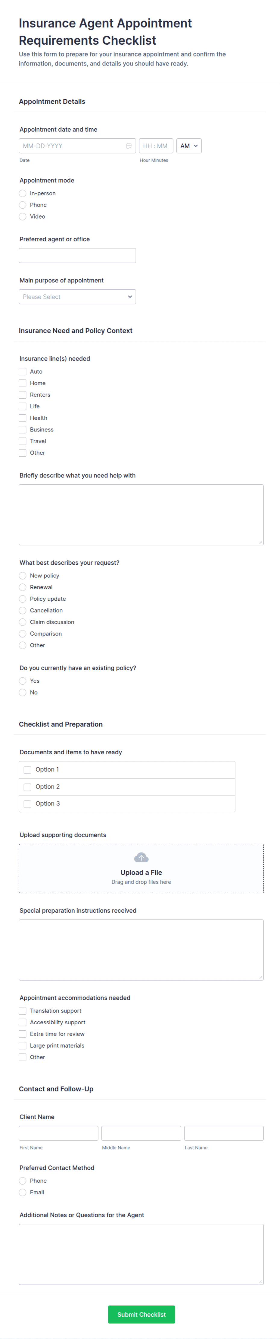 Appointment Checklist Form Templates are specialized digital forms designed to help individuals and organizations efficiently manage, track, and confirm all necessary steps before, during, and after appointments. These templates are commonly used in healthcare, beauty salons, consulting agencies, automotive services, and other industries where appointments are a core part of daily operations. By providing a structured checklist, these forms ensure that both service providers and clients are prepared, reducing the risk of missed steps, miscommunication, or incomplete appointments. Use cases range from pre-appointment preparations and client intake to post-appointment follow-ups and compliance checks.