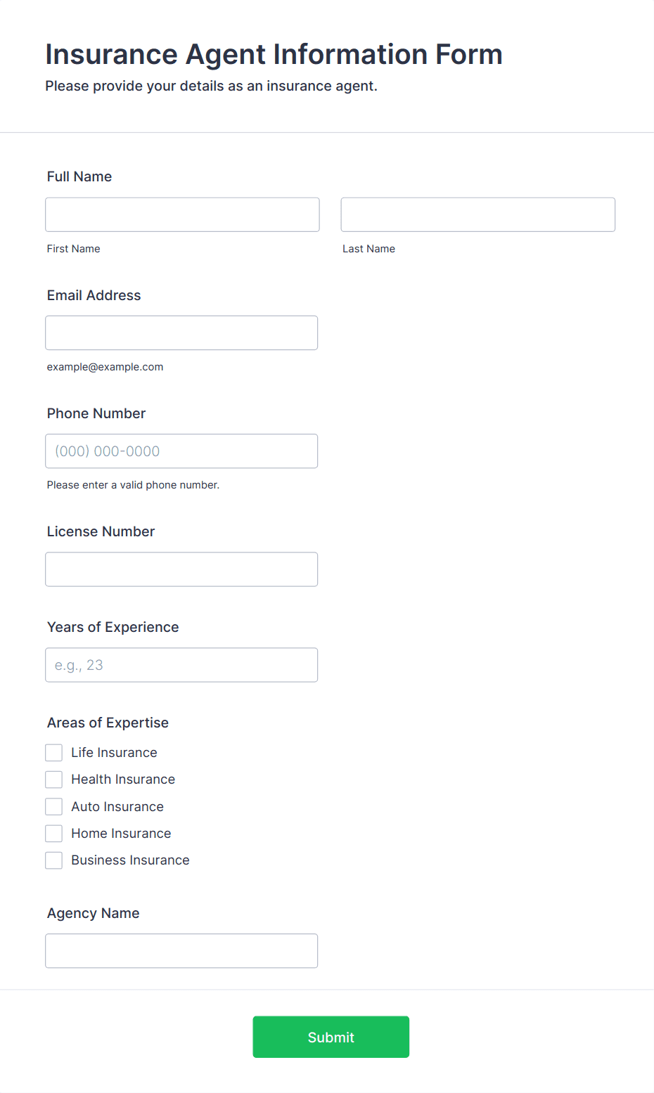 Use an Insurance Agent Information Form when onboarding new insurance agents or when you need to update the information of existing agents within your agency.