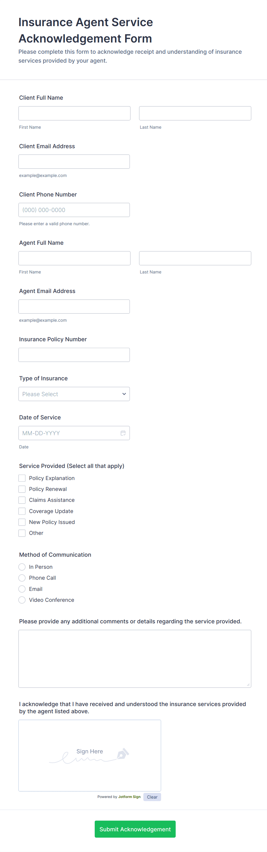 Most teams include client and agent contact details, a way to reference the policy, the date of service, and an acknowledgement signature so the form submission can be confidently filed and retrieved later.