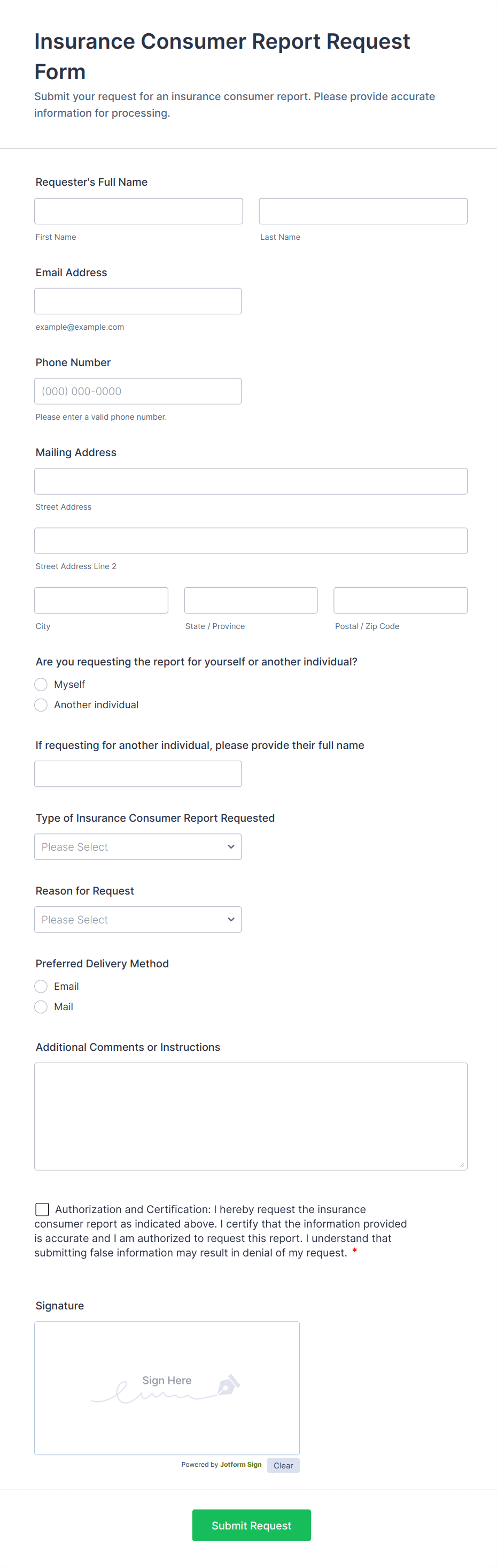 Simplify receiving insurance quotes and information with an insurance form template. With a fully customizable insurance form template, streamline processes and cut out the paperwork by receiving the information you need. Insurance data will be safely and securely collected, and neatly stored in your Jotform dashboard. You can also integrate your data with your favorite business tools, so that your data will automatically populate tools that you use everyday. All you need to do is select a template (or create a form from scratch), customize it to your liking, and publish! Your insurance form will be collecting quotes in no time.