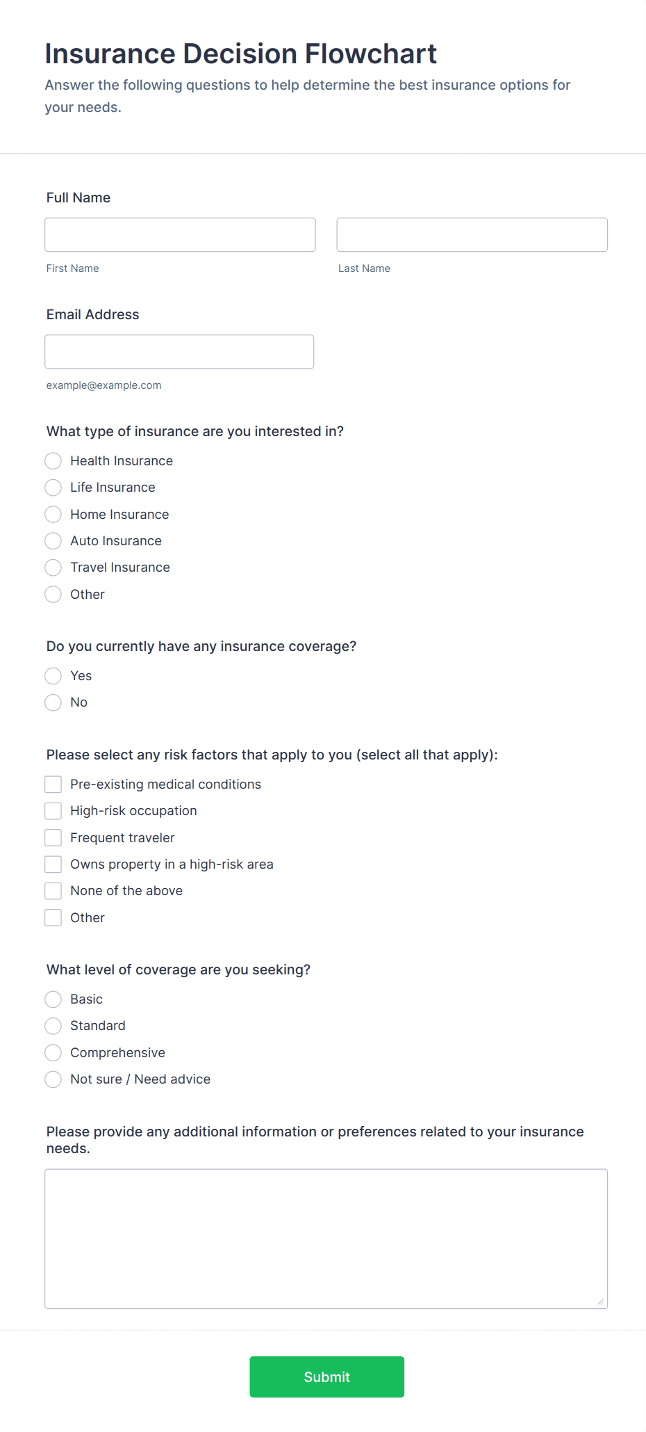 You should use this form at the start of the insurance sales process — for example on your website, in email campaigns, or during client intake — to quickly assess needs before offering quotes or scheduling consultations.