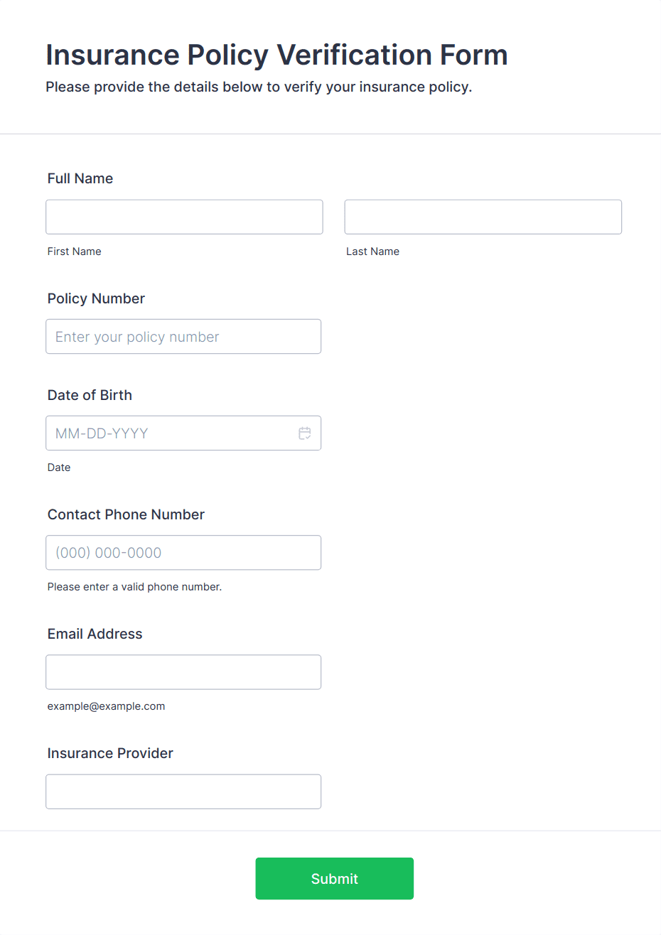 Verification forms are specialized digital tools designed to authenticate, validate, or confirm information provided by individuals or organizations. These forms are commonly used to verify identities, credentials, employment status, addresses, or other critical data points in a secure and efficient manner. Typical use cases include onboarding new employees, confirming student enrollment, validating customer identities for financial services, or ensuring the accuracy of submitted documents in compliance processes. By streamlining the verification process, these forms help organizations reduce fraud, maintain regulatory compliance, and build trust with their stakeholders.