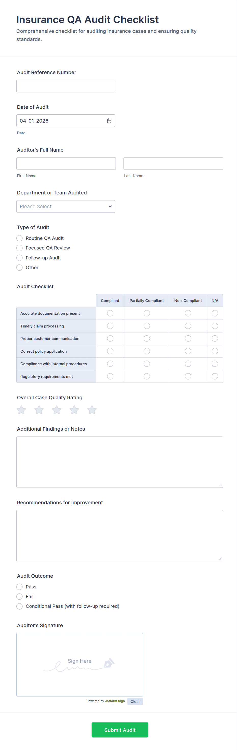 • Compliance Audits: Require fields for regulatory references, evidence collection, and sign-off sections.