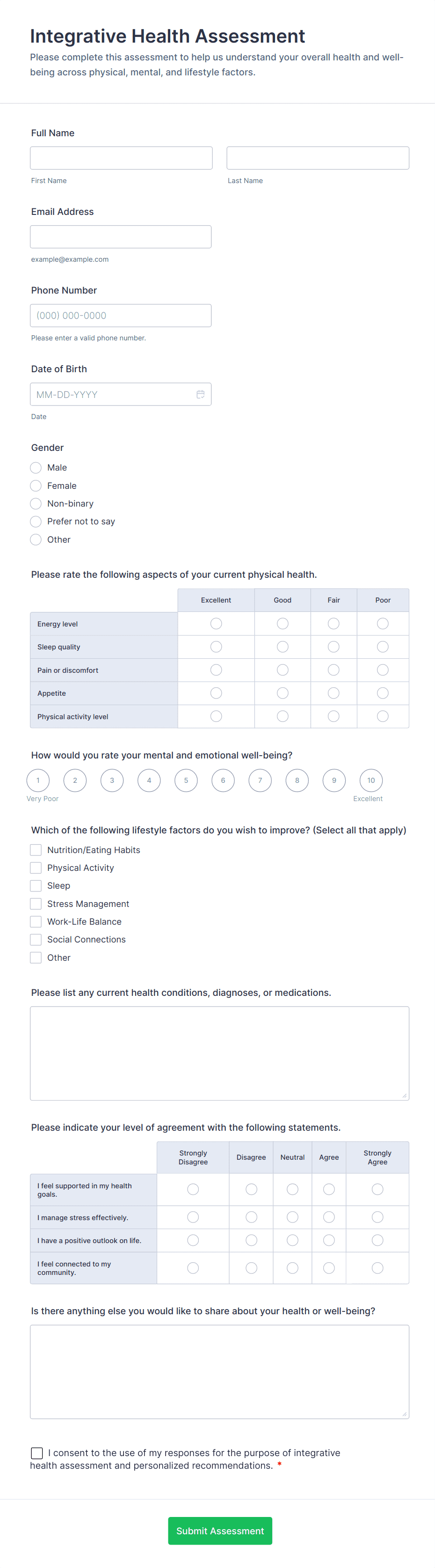 Add fields for symptoms, medical history, medications, allergies, lifestyle factors, and functional status depending on the assessment type. Use rating scales for severity and impact.