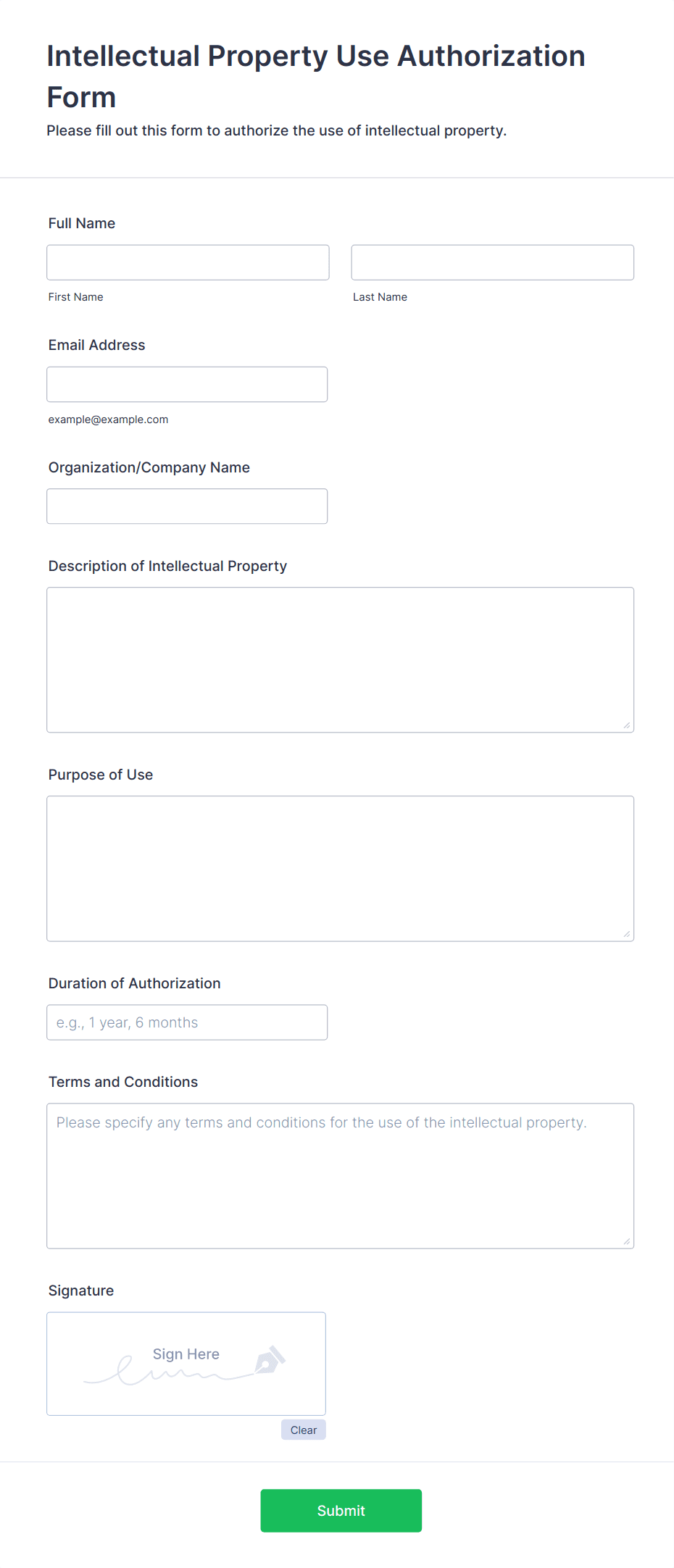 The form templates here are for informational purposes only. Jotform is not providing legal, financial, or other advice, or implying that the forms are legally valid in all or any jurisdictions. Before using any such form, consult an attorney and/or other applicable professionals to make sure that the form meets your needs, legally and otherwise.