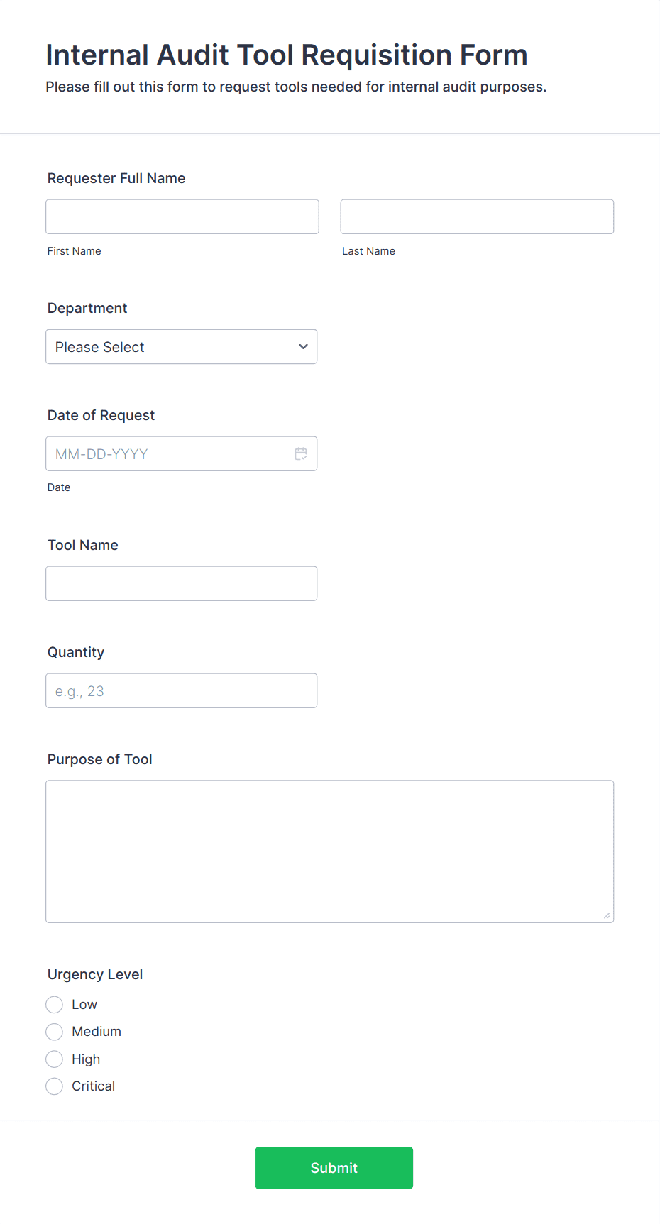 - Compliance Audits: Require fields for regulatory references, evidence collection, and sign-off sections.
