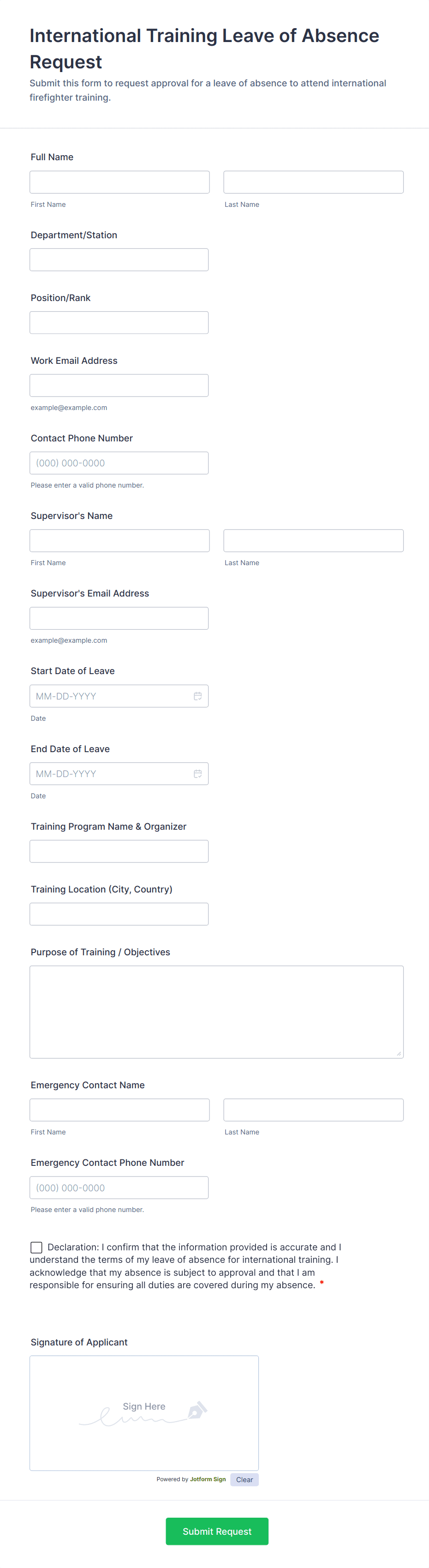 Leave Request Form Templates are digital forms designed to streamline the process of requesting and managing employee absences within organizations. These templates are commonly used by HR departments, team leaders, and managers to collect essential information from employees who need to take time off for reasons such as vacation, sick leave, personal days, parental leave, or other special circumstances. By standardizing the leave request process, these forms help ensure that all necessary details—such as dates, type of leave, reason for absence, and approval status—are captured efficiently and consistently. Use cases range from small businesses tracking vacation days to large enterprises managing complex leave policies across multiple departments.