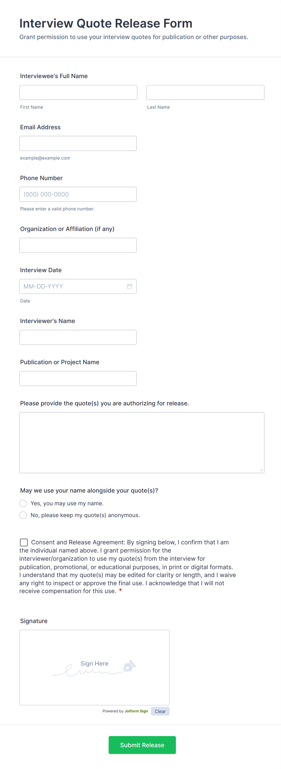 A media release form lets you collect and store information related to press releases and media releases. Focus on your next press release without worrying about losing a single piece of important information with Jotform!
