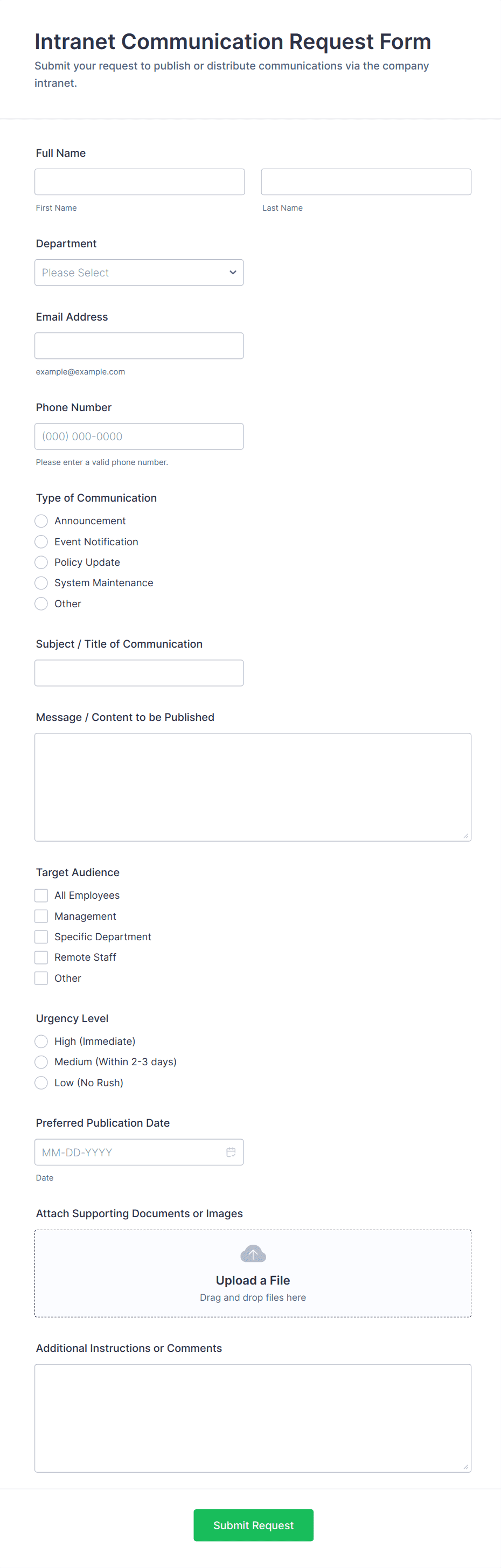 Common fields include requestor details, issue or request description, device or software information, urgency level, and supporting documentation.