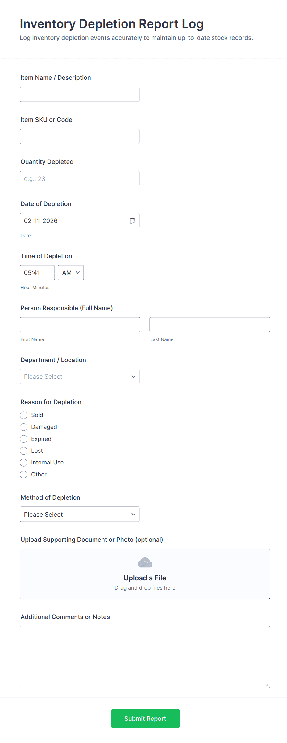 • For business reports: Include fields for dates, metrics, comments, and file uploads.