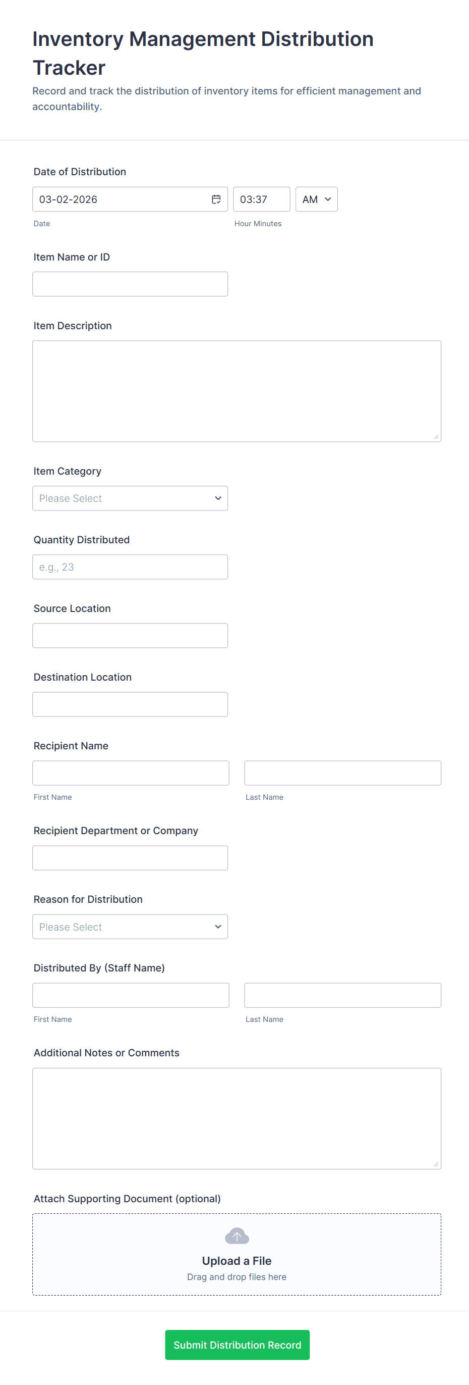 An Asset Tracking Form is a digital tool used to record, monitor, and manage information about physical or digital assets, such as equipment, inventory, or vehicles, throughout their lifecycle.