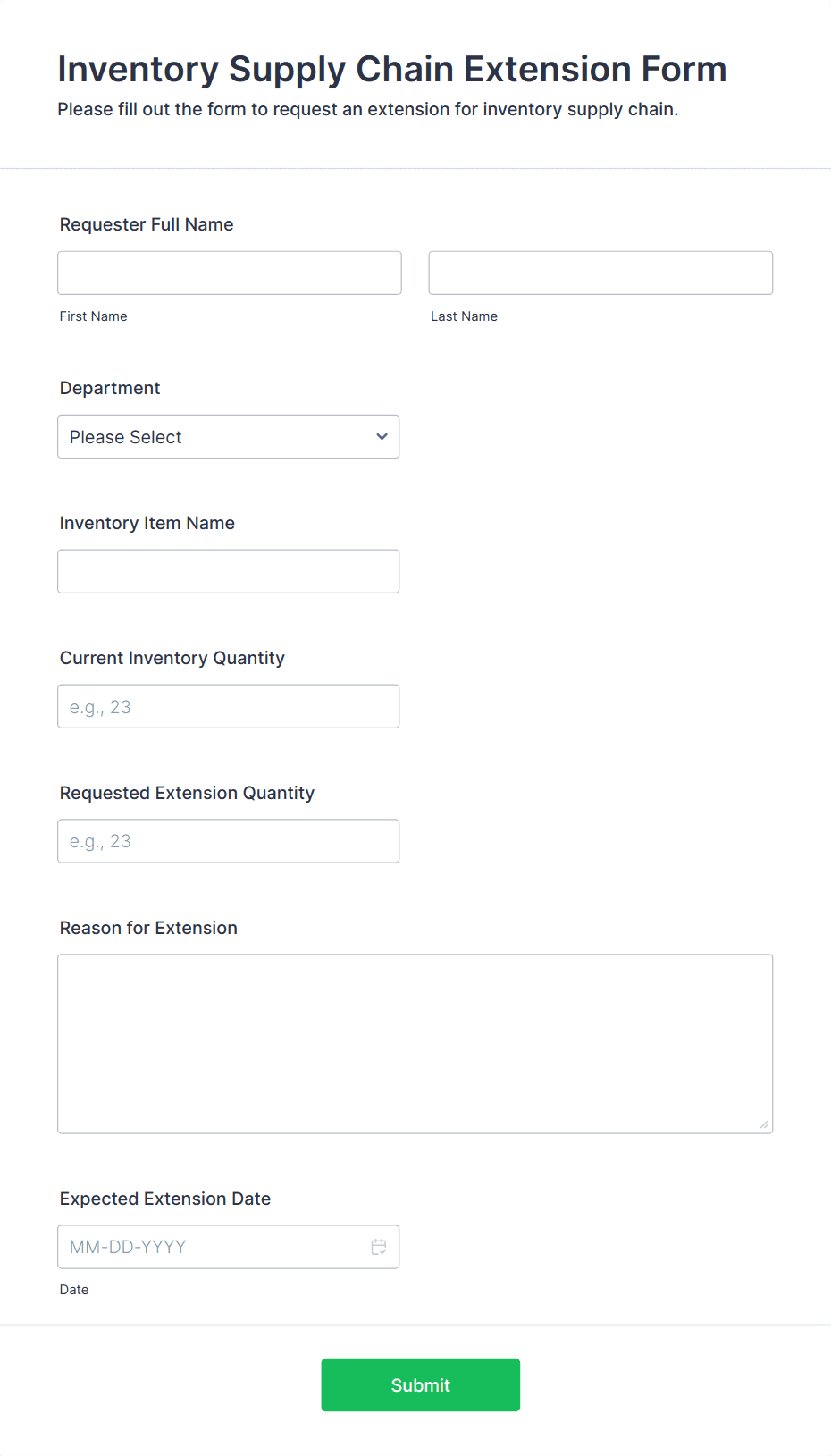 • For inventory restocking, integrate fields for SKU numbers and reorder levels.