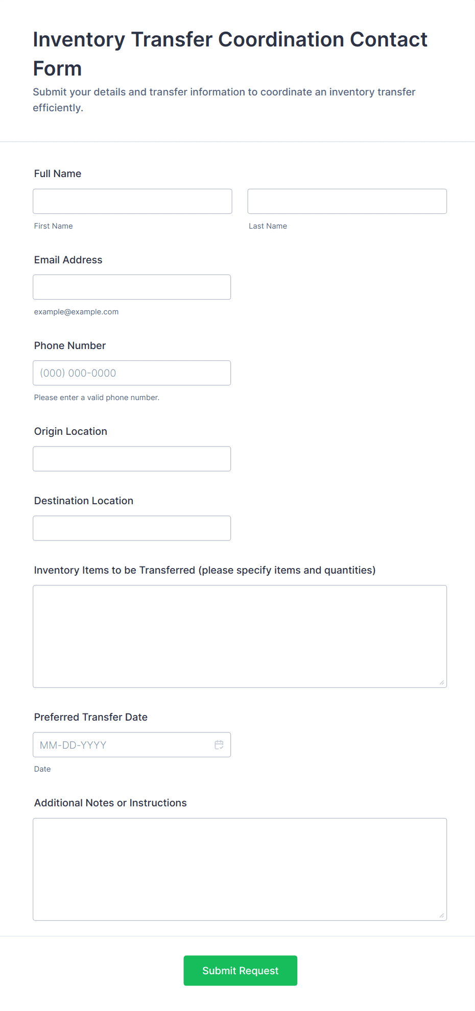 • Inventory Tracking: Forms may include fields for item name, SKU, quantity, location, and restock dates.