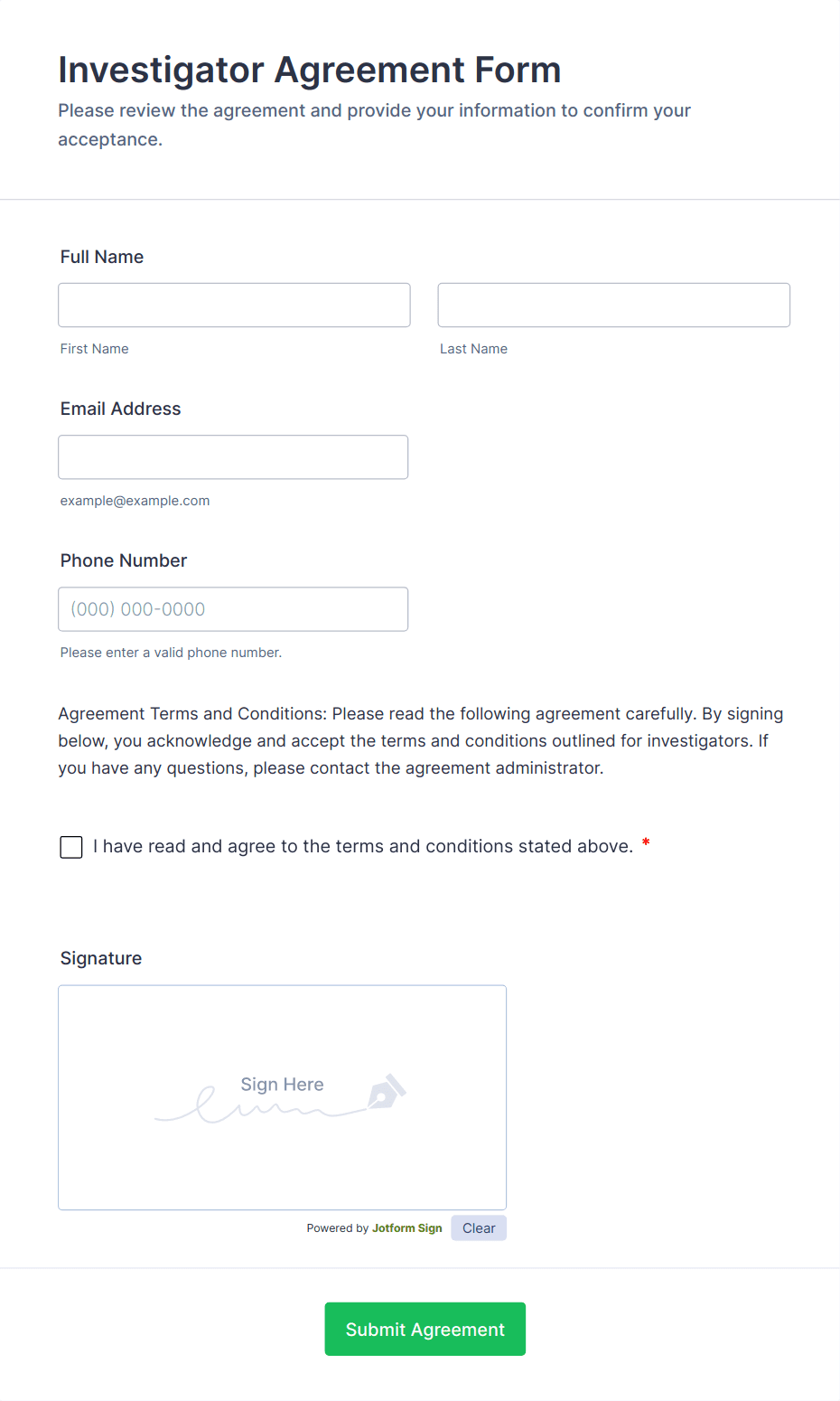 The form templates here are for informational purposes only. Jotform is not providing legal, financial, or other advice, or implying that the forms are legally valid in all or any jurisdictions. Before using any such form, consult an attorney and/or other applicable professionals to make sure that the form meets your needs, legally and otherwise.