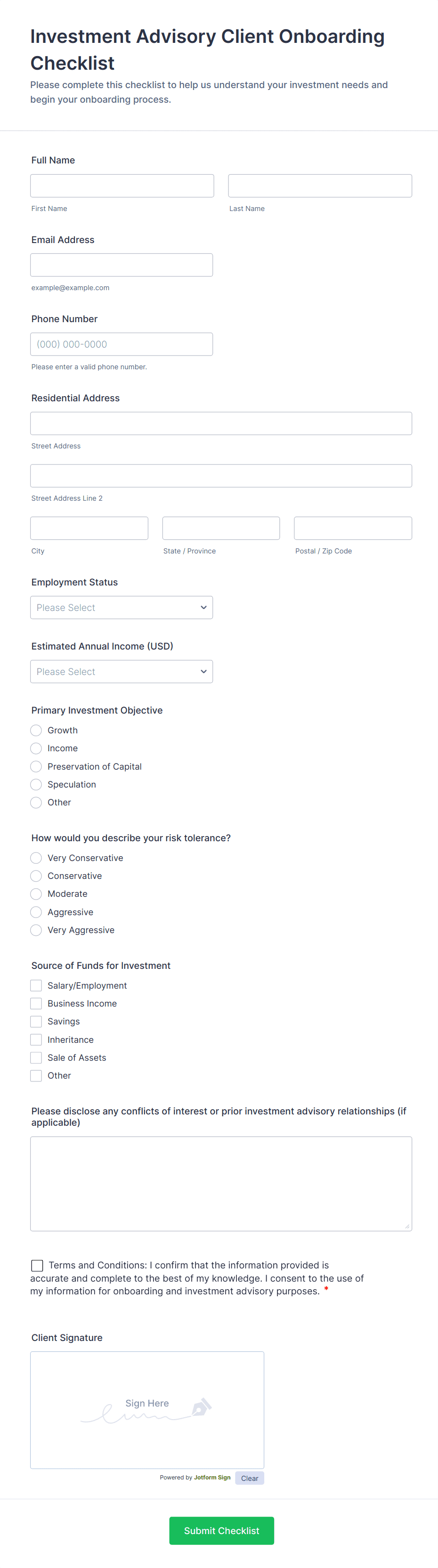 Give your clients peace of mind with Jotform’s secure online Financial Advisor Forms. From any device you can gather client intake information, W4 and W9 data, and finance declaration forms and applications. Choose from one of our free form templates below, and customize it to make it your own without any coding with just a few clicks. Drag and drop to edit premade text fields and checklist items, add your own personal branding, install widgets, choose fonts and colors, and more. You can also charge clients directly from your form with our 30+ payment processor integrations — which charge no additional transaction fees. Sensitive client information is instantly synced and stored in your secure online account. Create a seamless intake process for your clients with our free Financial Advisor Forms.