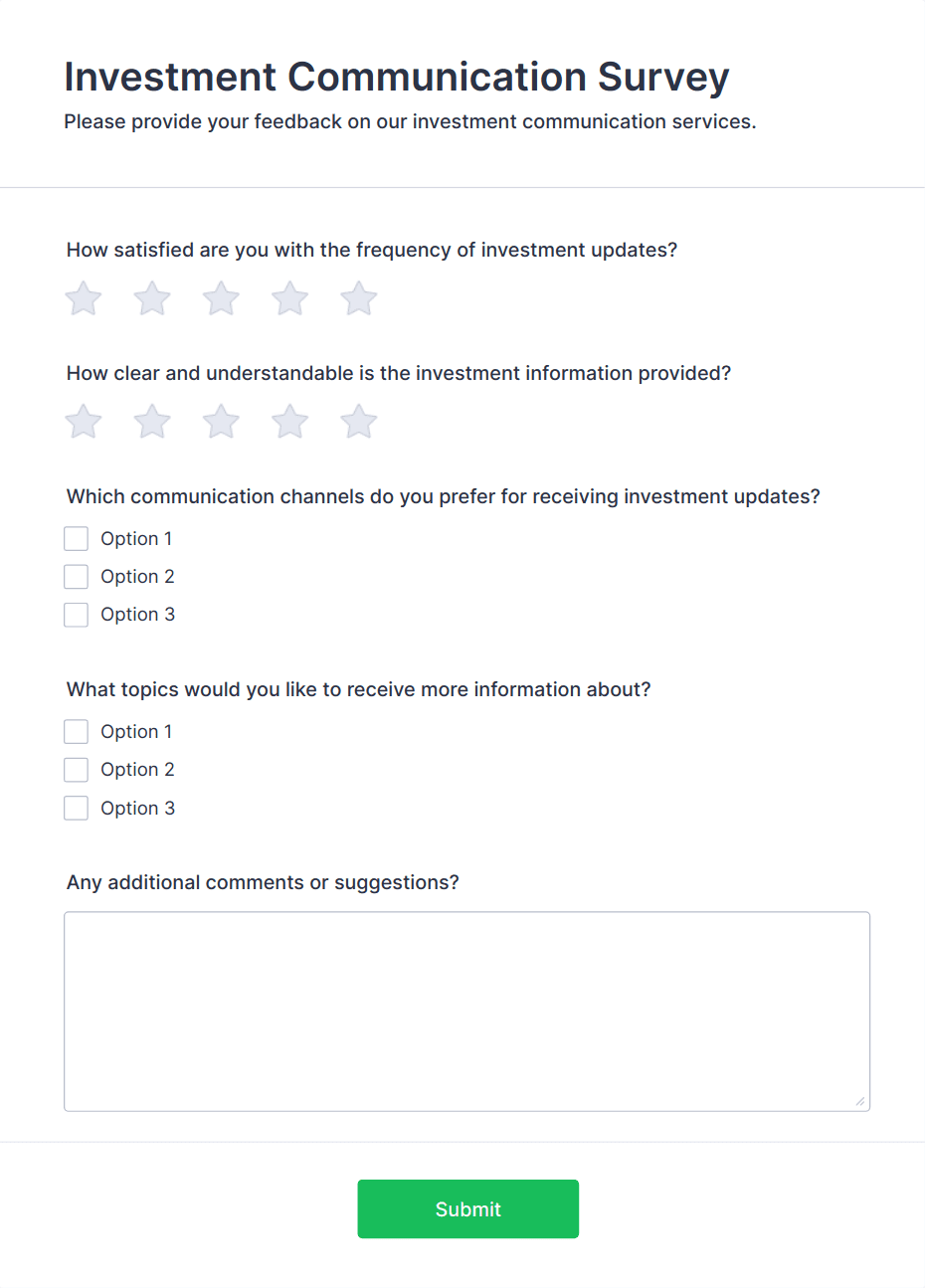 A company survey form creates a feedback survey that allows customers or employees share opinions, comments, or suggestions in a survey or questionnaire.