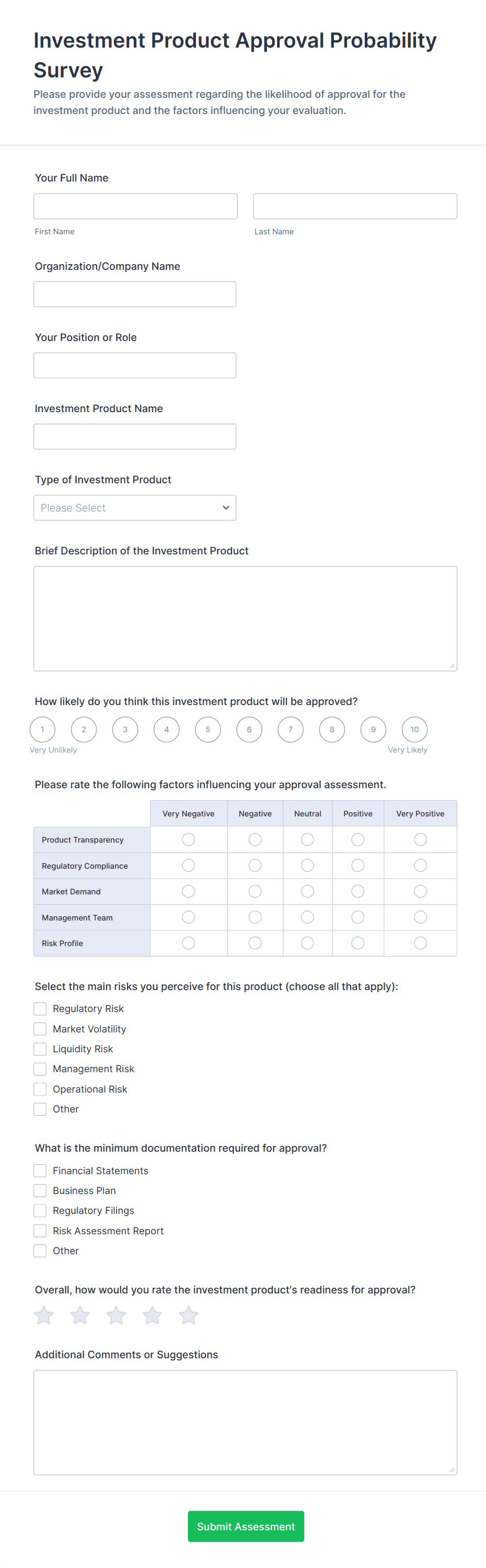 Product Survey Templates are pre-designed forms specifically created to help businesses, product managers, marketers, and researchers gather valuable feedback about products from customers, users, or stakeholders. These templates are used to assess customer satisfaction, collect suggestions for improvement, evaluate product features, and understand user experiences. Product survey forms can be utilized at various stages of a product’s lifecycle — from initial concept testing and beta launches to post-purchase feedback and ongoing product improvement. Common use cases include new product feedback, feature prioritization, usability testing, and post-launch satisfaction surveys.