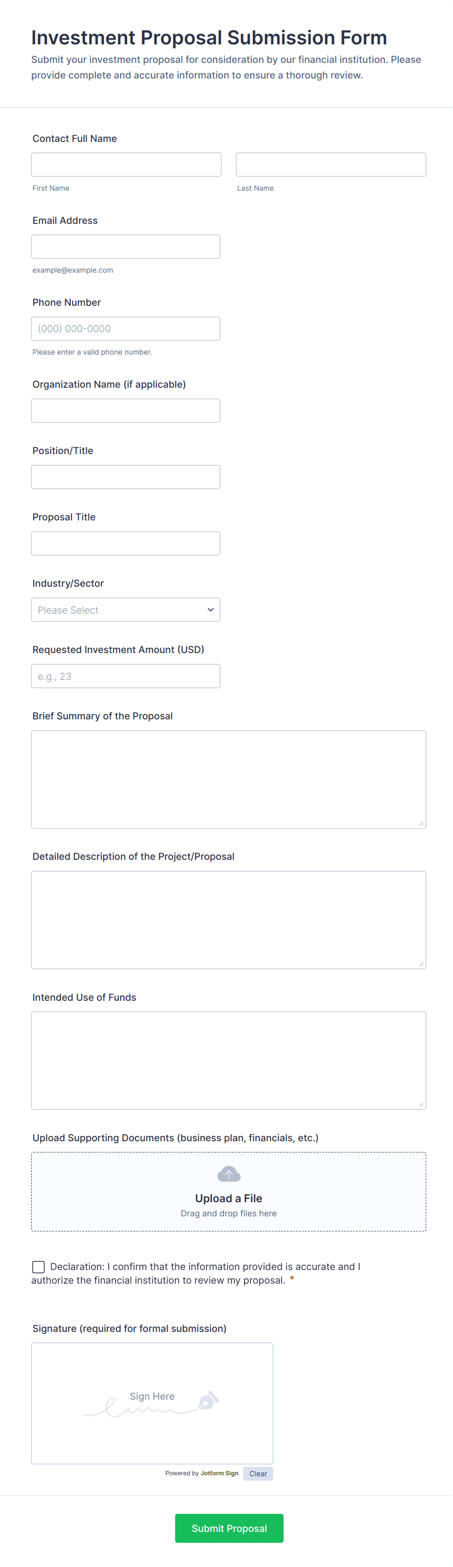 Collect and manage investing information from any device with online Investor Forms from Jotform. Simply choose a template below and customize it with our no-code drag-and-drop builder — you can add your logo, change form fields, include widgets, or connect your form with 100+ free form integrations to sync data to other platforms automatically. Then embed your custom form in your website or share it with a link to start collecting responses instantly! Improve your investment business workflow with Jotform’s online Investor Forms.