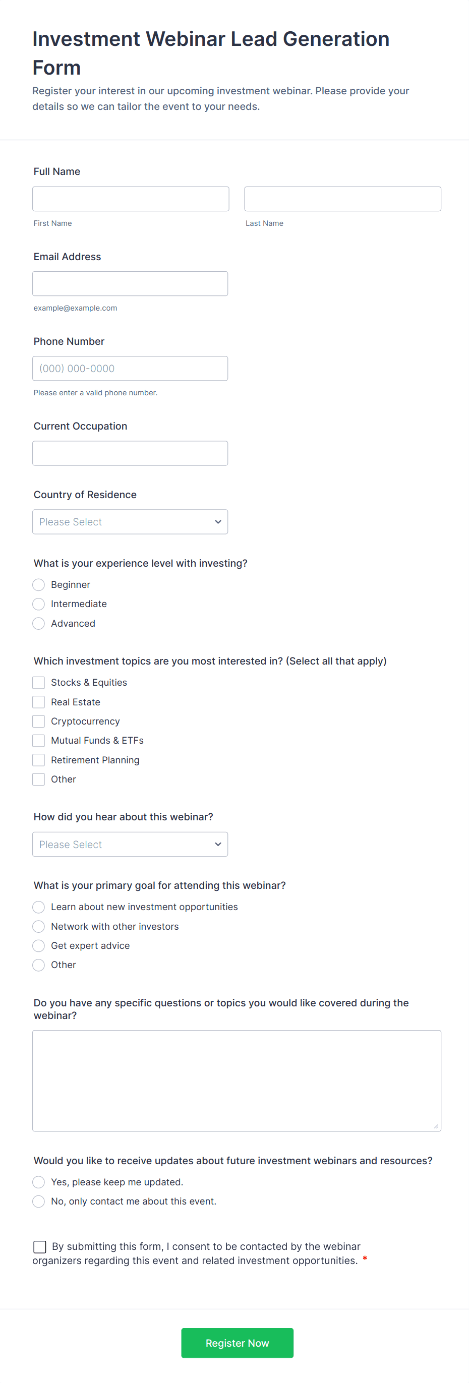 Lead generation forms are specialized online forms designed to capture valuable information from potential customers, clients, or prospects. These forms are commonly used by businesses and organizations to collect contact details, preferences, and other relevant data that can be used to nurture leads and drive sales or engagement. Typical use cases include newsletter sign-ups, event registrations, quote requests, demo bookings, and gated content downloads. By strategically placing lead generation forms on websites, landing pages, or social media, organizations can efficiently gather high-quality leads and streamline their marketing and sales processes.