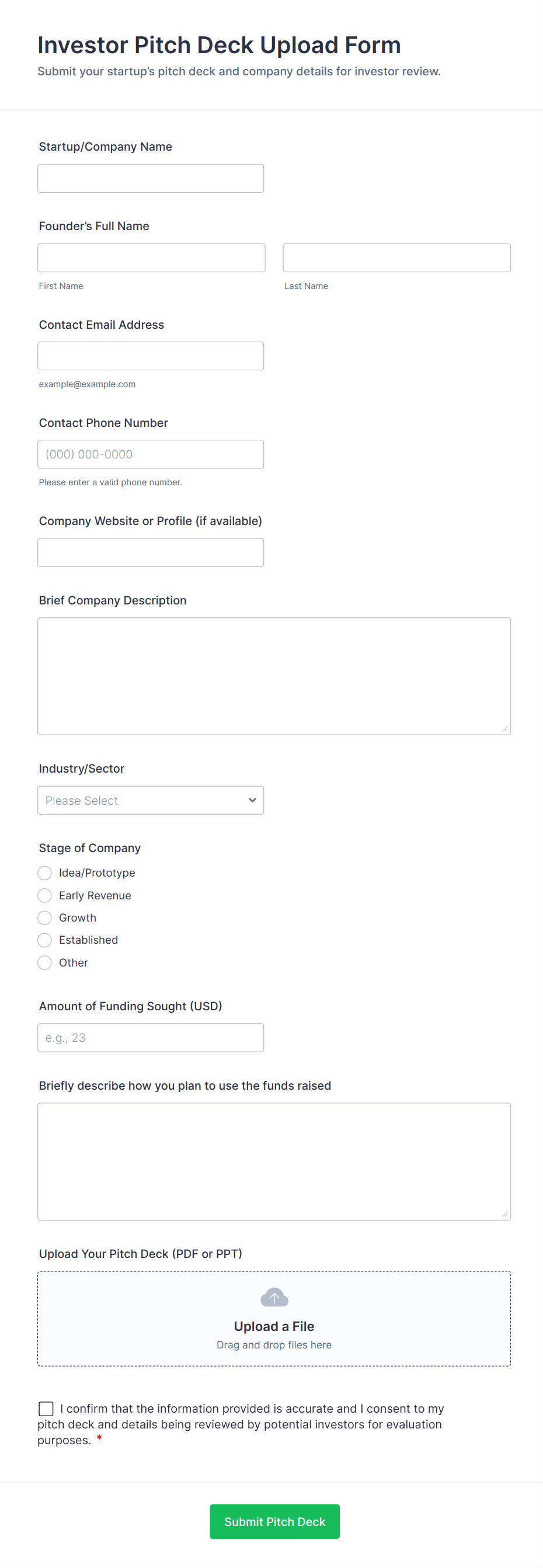 The Investor Information Form helps collect essential details from potential investors, streamlining the onboarding process for startups and investment firms.