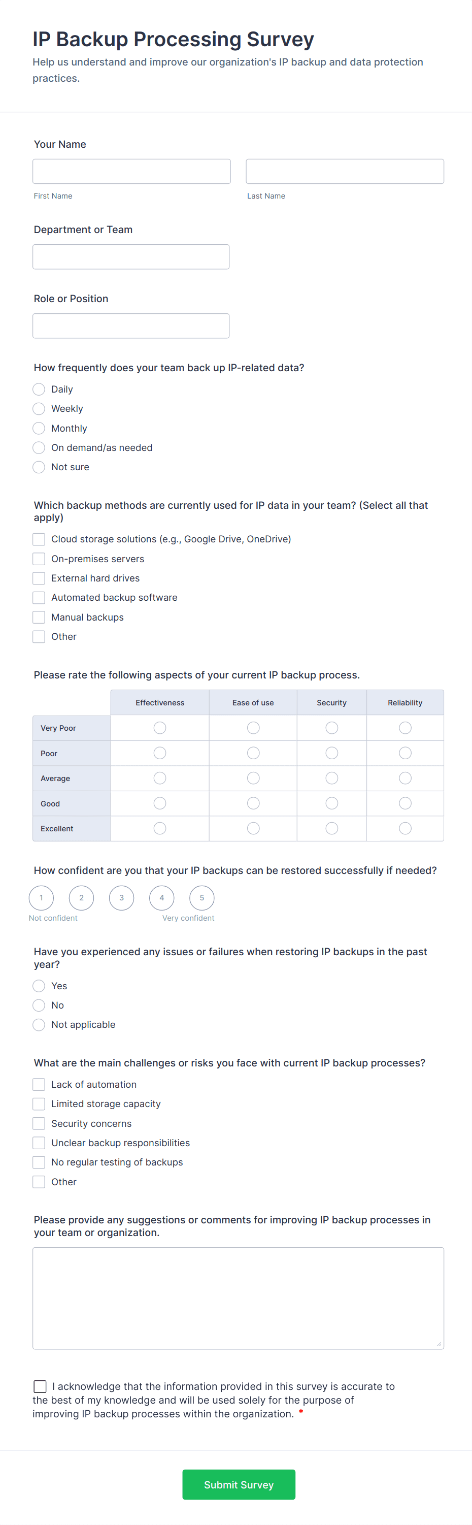 An Information Technology Survey is a form template designed to gather information about the use, satisfaction, and needs related to information technology within a specific context.