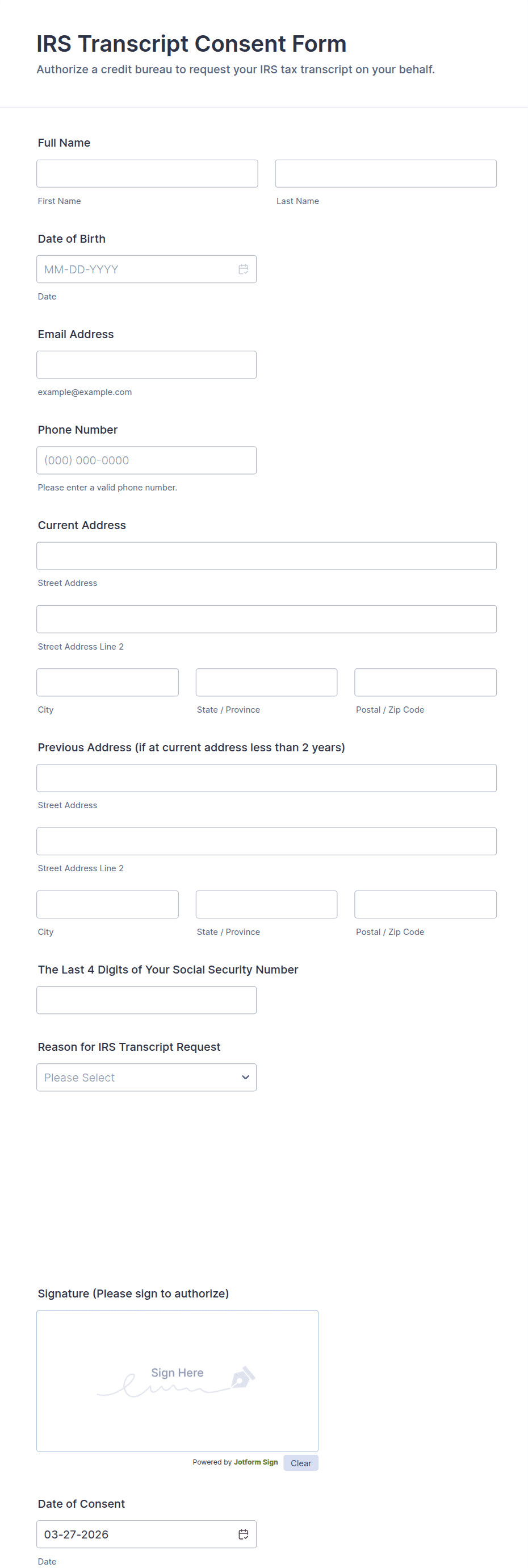 The form templates here are for informational purposes only. Jotform is not providing legal, financial, or other advice, or implying that the forms are legally valid in all or any jurisdictions. Before using any such form, consult an attorney and/or other applicable professionals to make sure that the form meets your needs, legally and otherwise.