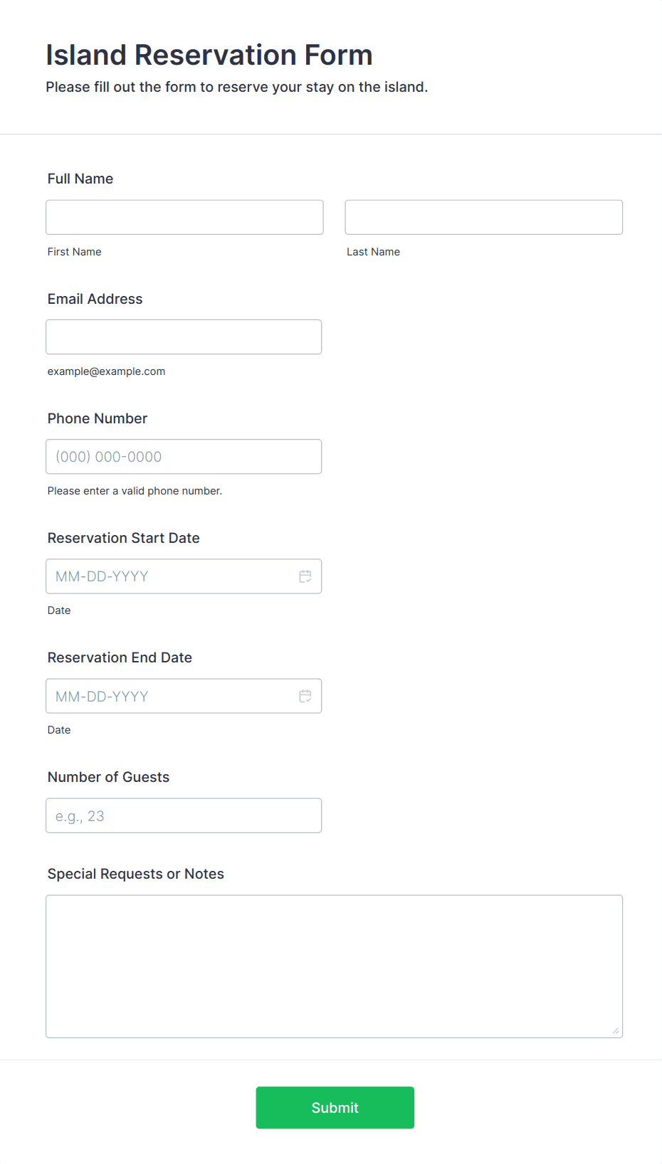 A simple form template which allows customers to submit their booking inquiry or any other comment with their contact information that would allow you to conveniently respond your customers to confirm the booking availability.