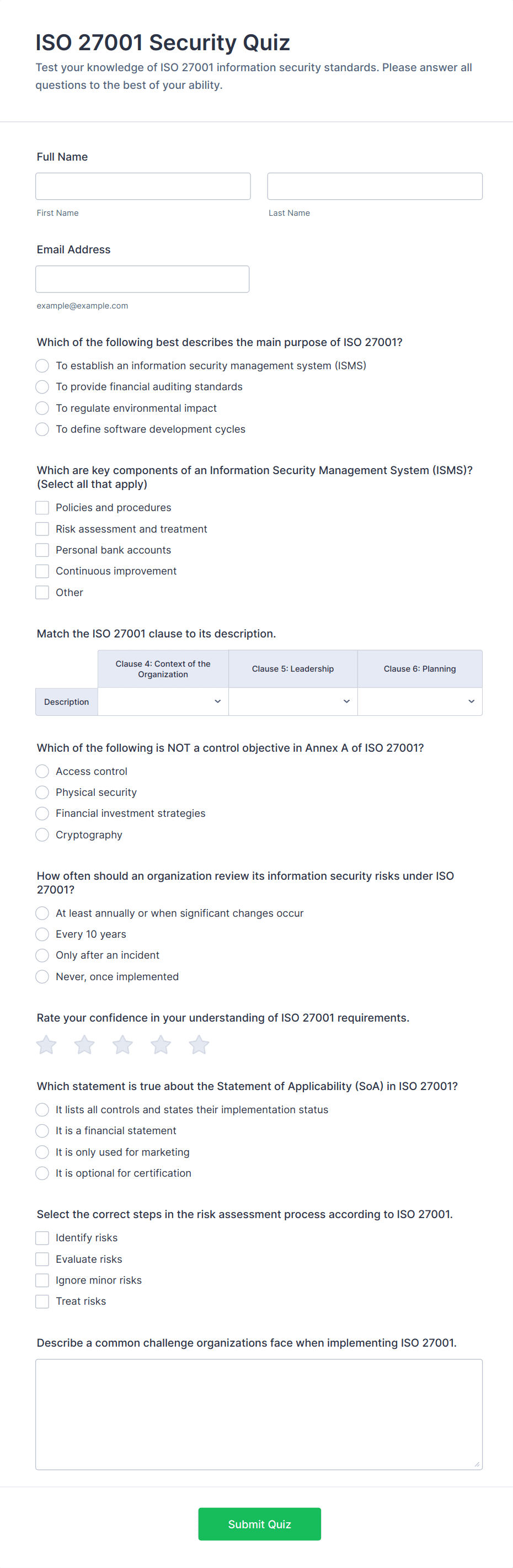 • For educational or compliance quizzes, include a mix of question types and set correct answers for automatic scoring.