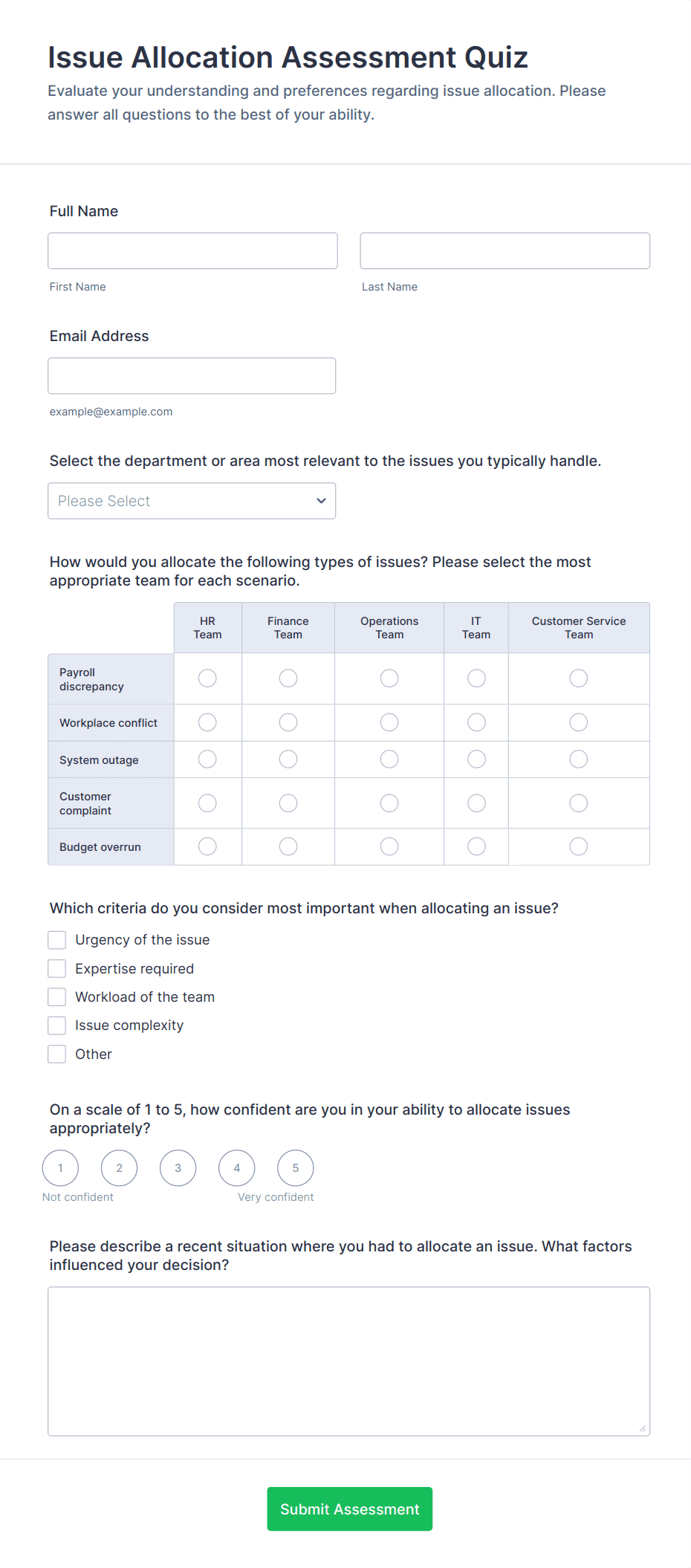 Quiz Templates are pre-designed forms specifically created to facilitate the process of building quizzes for a variety of purposes, such as education, employee training, lead generation, event engagement, and more. These templates provide a structured way to present questions, collect answers, and automatically score or evaluate responses. Whether you’re a teacher assessing student knowledge, a business running a product knowledge test, or a marketer creating a fun personality quiz, Quiz Templates offer a flexible foundation to suit your needs. They can be used for online exams, trivia games, onboarding assessments, customer feedback quizzes, and interactive learning modules.