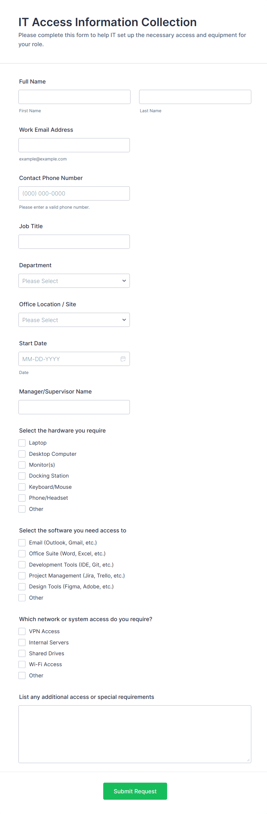 Collect requester name, department, contact info, and access type (physical, system, visitor). Include the reason for access and requested dates.