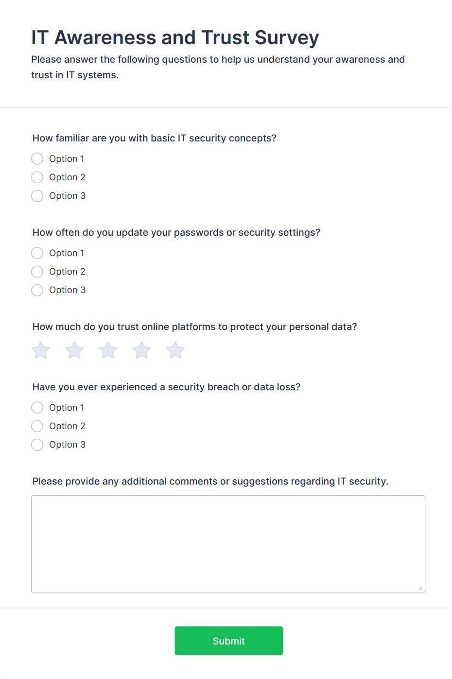 An Information Technology Survey is a form template designed to gather information about the use, satisfaction, and needs related to information technology within a specific context.