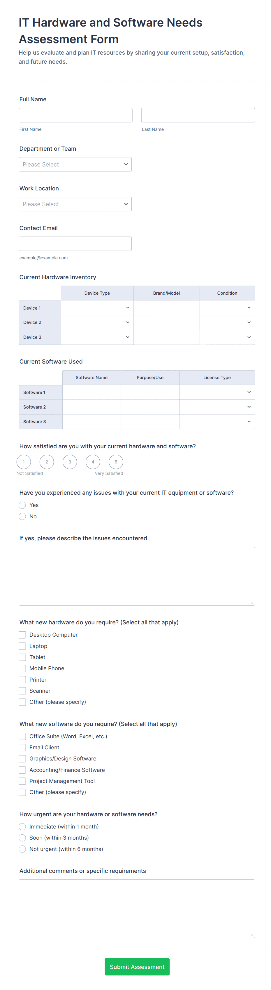 Common fields include requestor details, issue or request description, device or software information, urgency level, and supporting documentation.