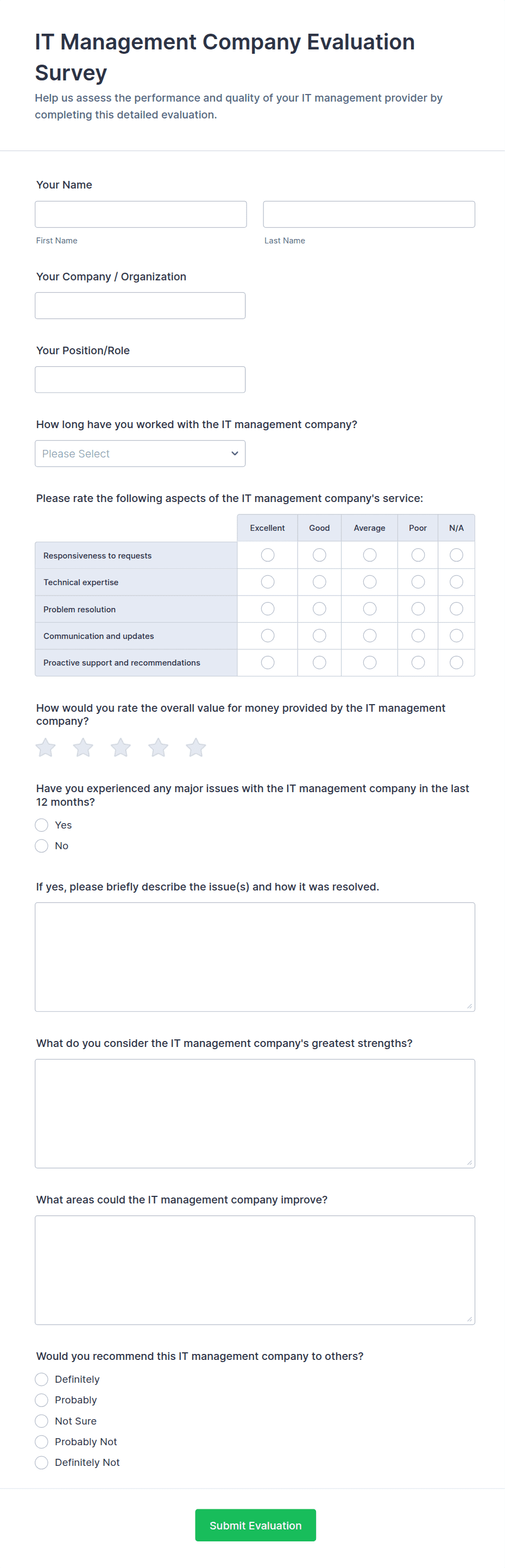 Let's measure how satisfied your customers are with the IT service you provide with the IT Satisfaction Survey. No code required!