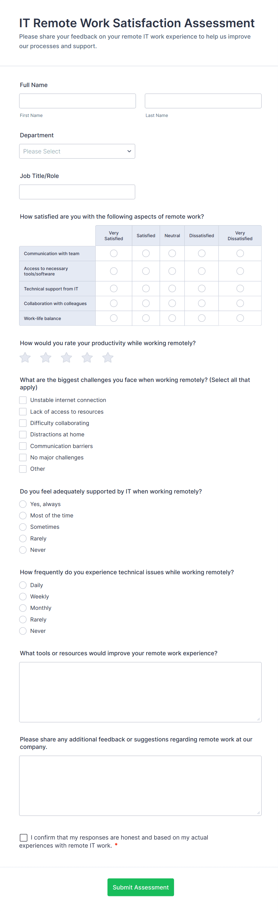 Analyze your current work from home policy with a free online Remote Work Survey. Ideal for coronavirus-related remote workplaces. Sync responses to 100+ apps.