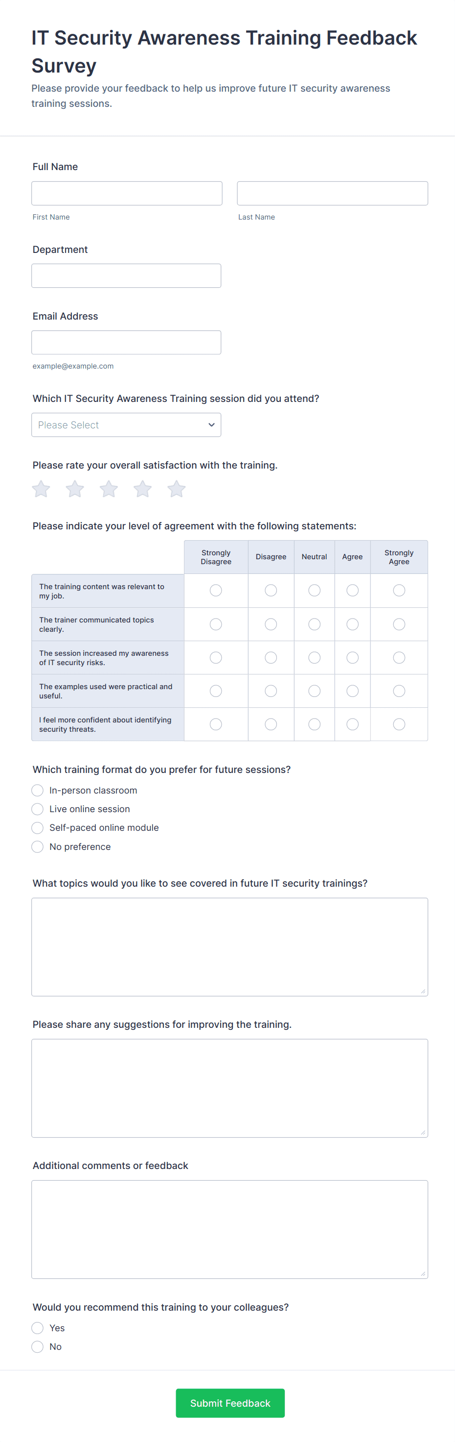 Training Survey Templates are specialized survey forms designed to gather feedback, measure learning outcomes, and assess the effectiveness of training programs. These templates are commonly used by HR departments, corporate trainers, educational institutions, and professional development organizations to evaluate participant satisfaction, knowledge retention, and areas for improvement. Use cases range from post-training feedback surveys and pre-training needs assessments to skills gap analyses and trainer evaluations. By collecting structured feedback, organizations can refine their training content, delivery methods, and overall learning strategies to better meet the needs of their audience.