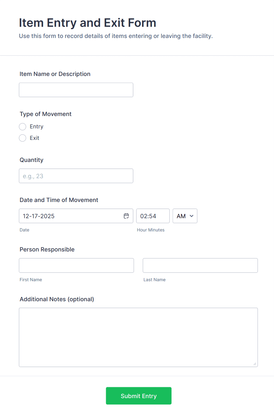 Common fields include item name, SKU or barcode, quantity, date/time, staff or requester details, and notes on condition or discrepancies.