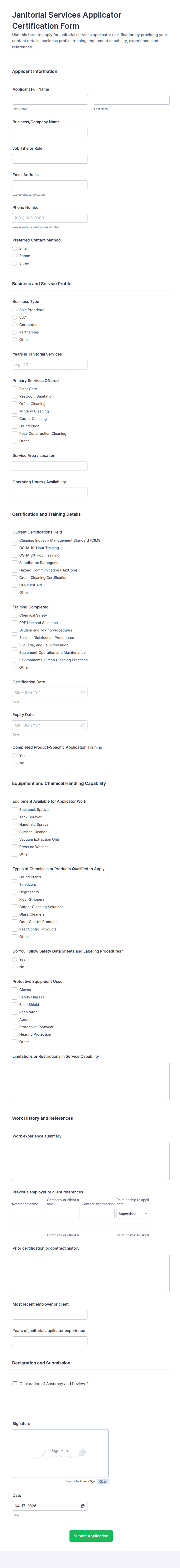 Cleaning Forms are specialized digital forms designed to streamline and organize the processes involved in cleaning services, facility maintenance, and janitorial operations. These forms can be used for a variety of purposes, such as scheduling cleaning appointments, conducting cleaning inspections, tracking supply usage, logging completed tasks, and collecting client feedback. Whether you manage a commercial cleaning company, oversee in-house custodial teams, or offer residential cleaning services, Cleaning Forms help ensure that all tasks are documented, standards are met, and communication between staff and clients remains clear and efficient.