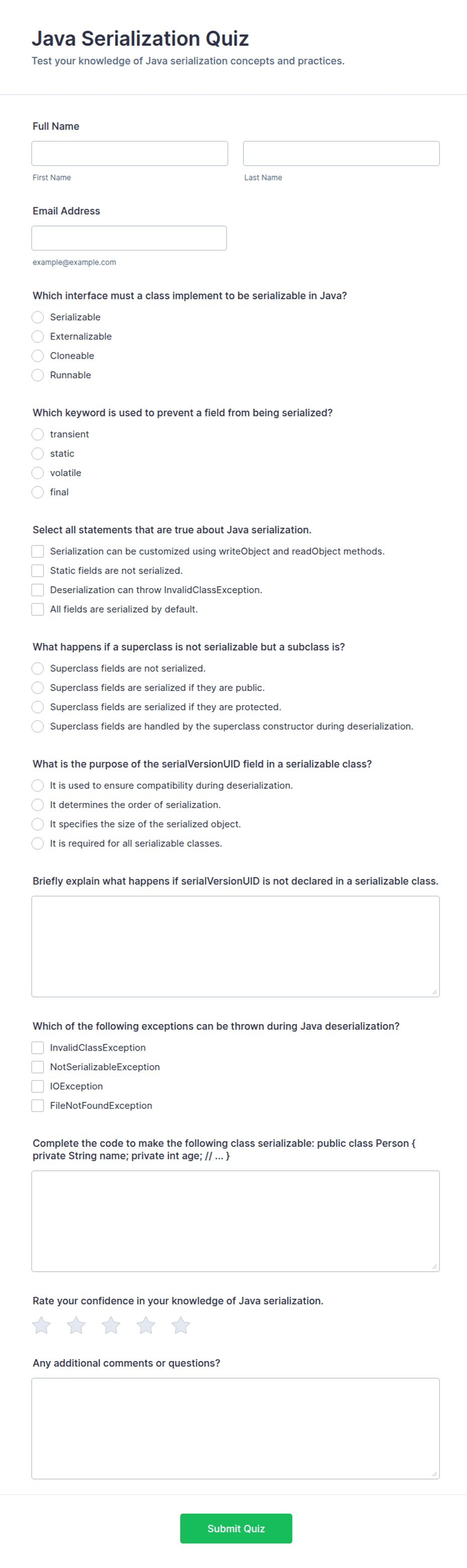 Quiz Templates are pre-designed forms specifically created to facilitate the process of building quizzes for a variety of purposes, such as education, employee training, lead generation, event engagement, and more. These templates provide a structured way to present questions, collect answers, and automatically score or evaluate responses. Whether you’re a teacher assessing student knowledge, a business running a product knowledge test, or a marketer creating a fun personality quiz, Quiz Templates offer a flexible foundation to suit your needs. They can be used for online exams, trivia games, onboarding assessments, customer feedback quizzes, and interactive learning modules.