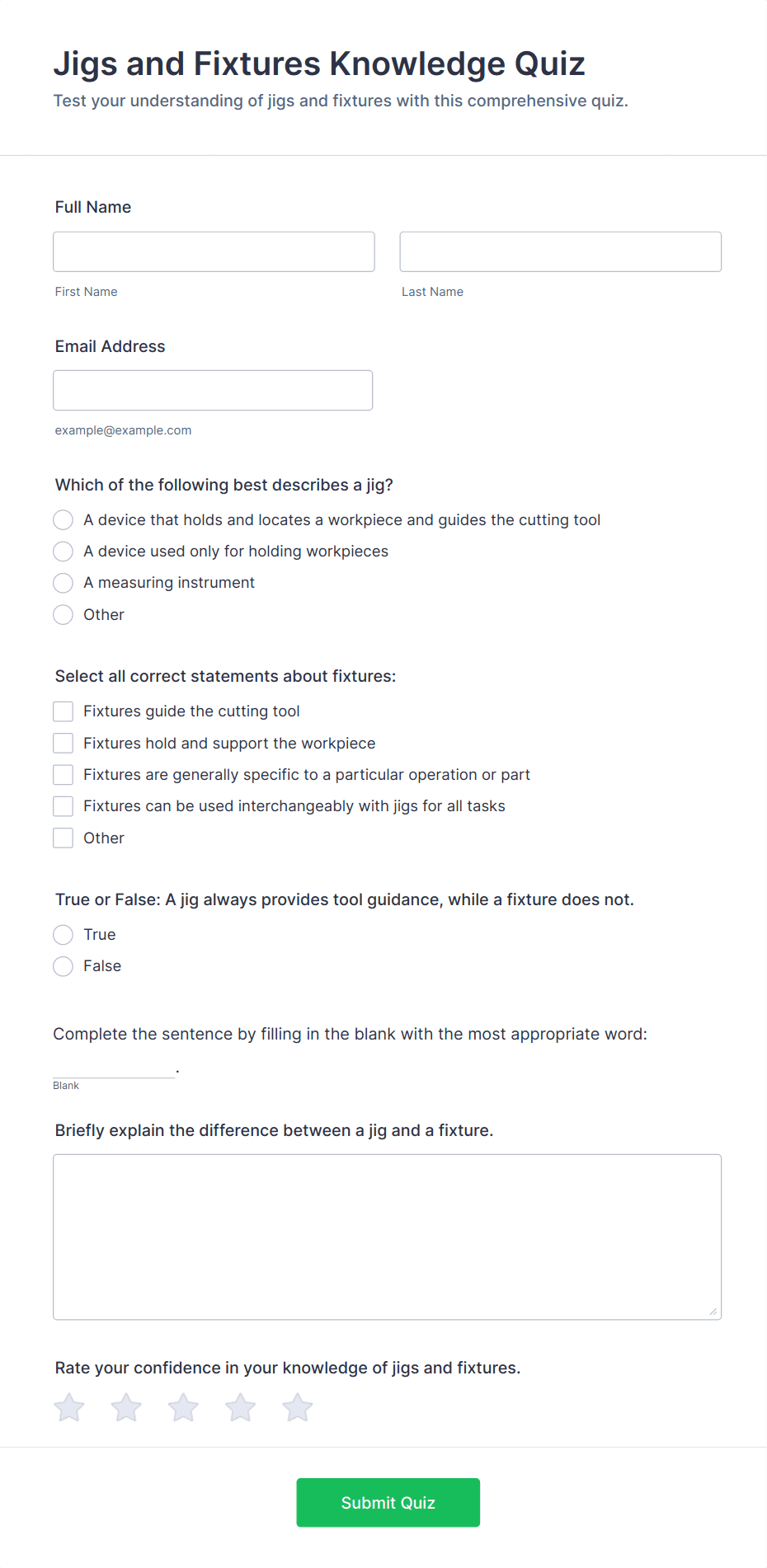 Quiz Templates are pre-designed forms specifically created to facilitate the process of building quizzes for a variety of purposes, such as education, employee training, lead generation, event engagement, and more. These templates provide a structured way to present questions, collect answers, and automatically score or evaluate responses. Whether you’re a teacher assessing student knowledge, a business running a product knowledge test, or a marketer creating a fun personality quiz, Quiz Templates offer a flexible foundation to suit your needs. They can be used for online exams, trivia games, onboarding assessments, customer feedback quizzes, and interactive learning modules.