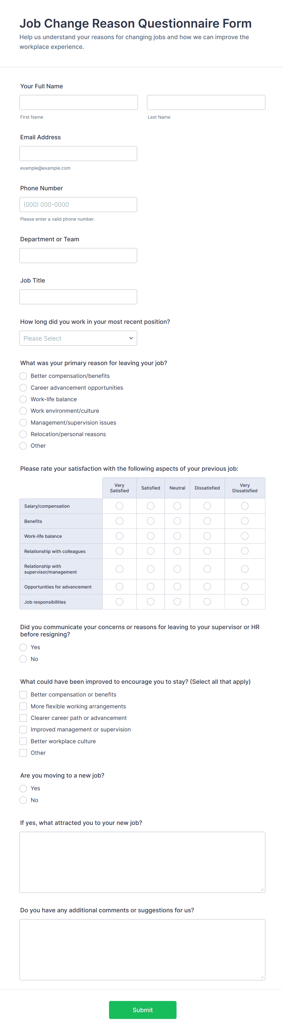 Seamlessly gather employee feedback with this free online Exit Interview. Customize the form in seconds and use the results to improve your company.