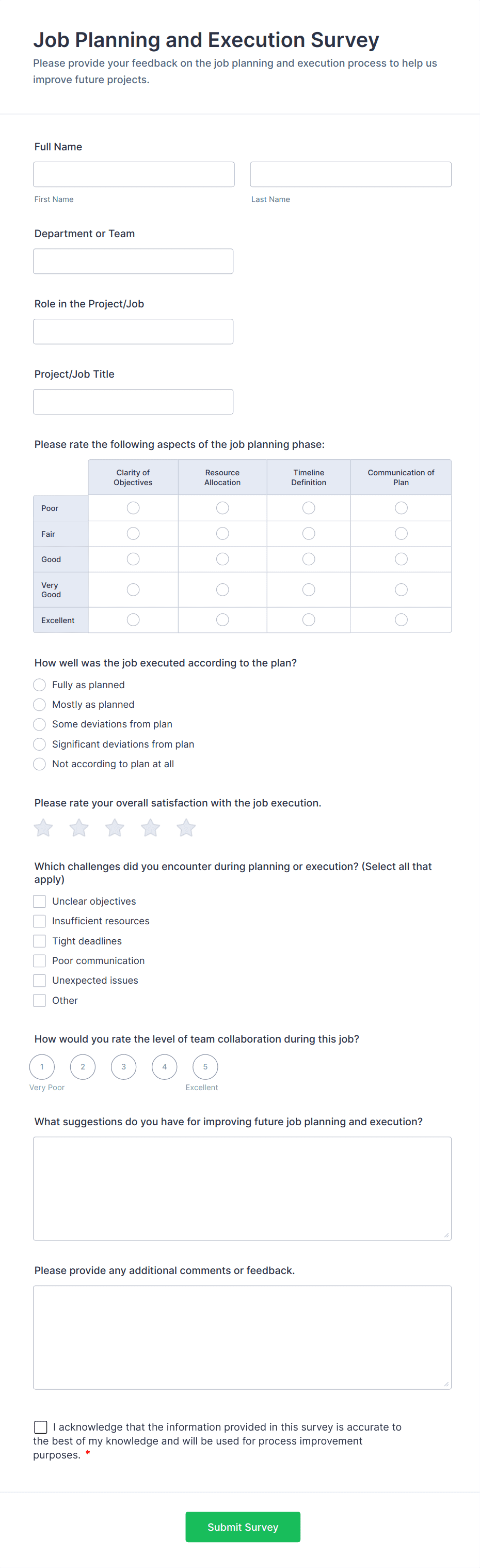 • Short and long text fields for open-ended feedback.
