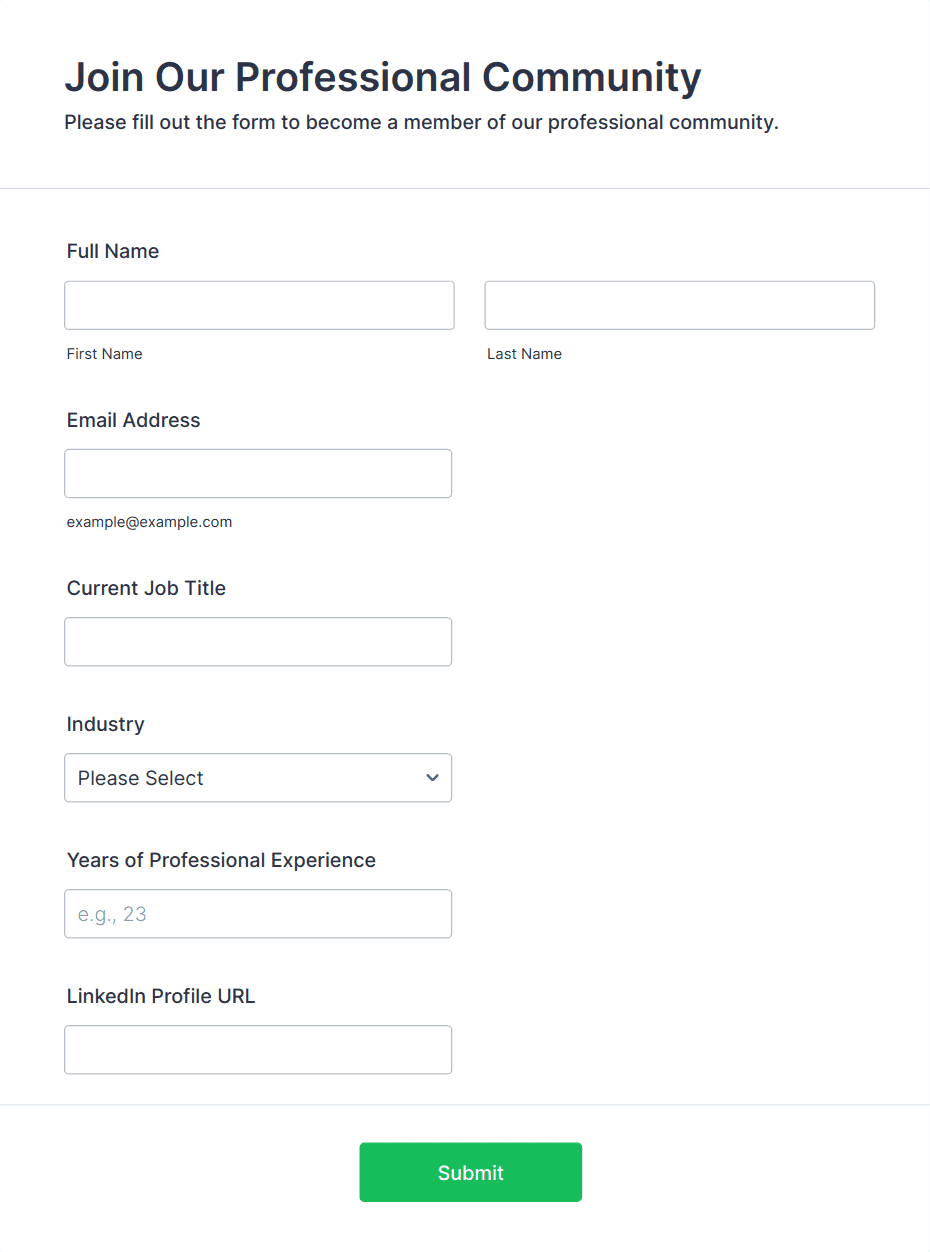 • Newsletter Sign Up: Typically requires only name and email, with optional interest checkboxes.