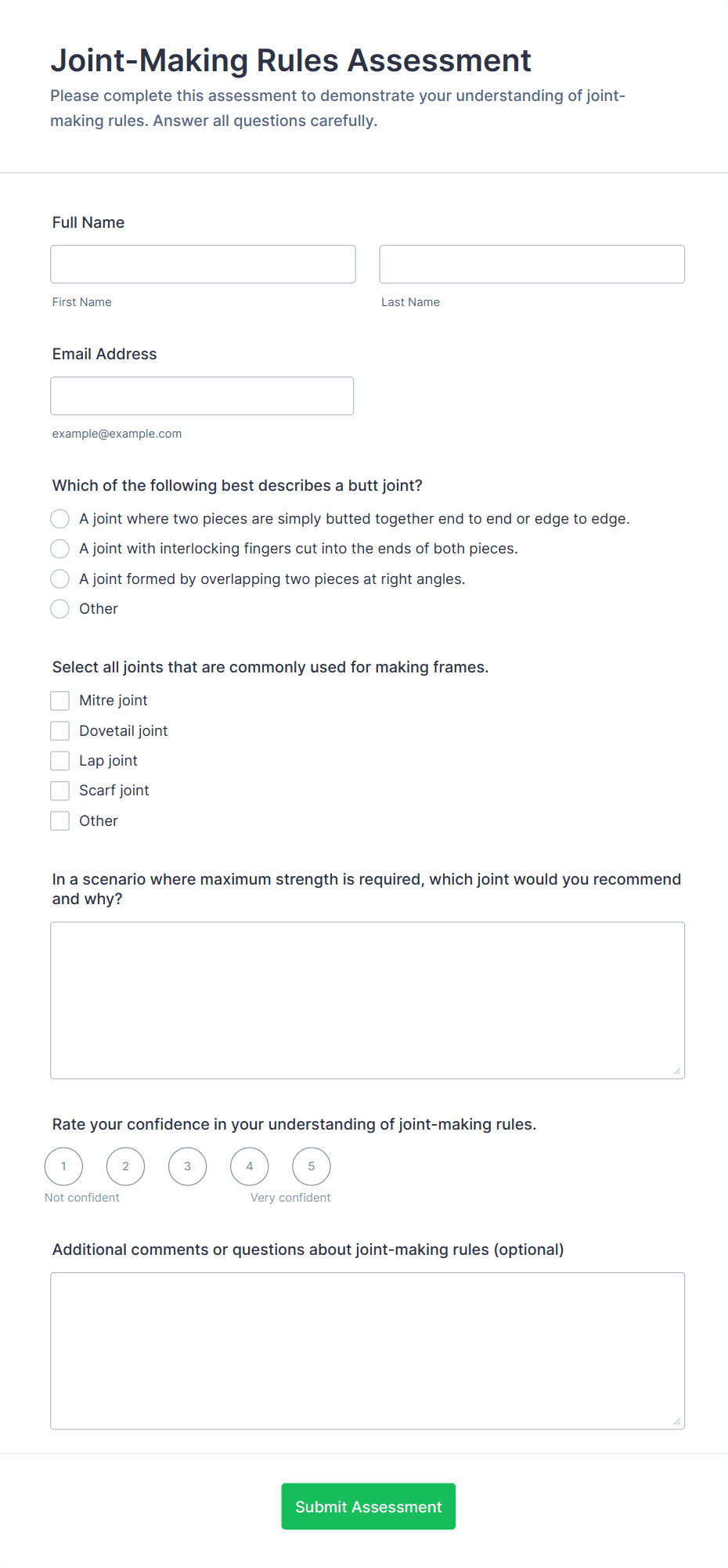 The Joint-Making Rules Assessment Form Template helps instructors and training programs evaluate learners’ understanding of woodworking joints, capture confidence levels, and collect written explanations in one organized assessment.