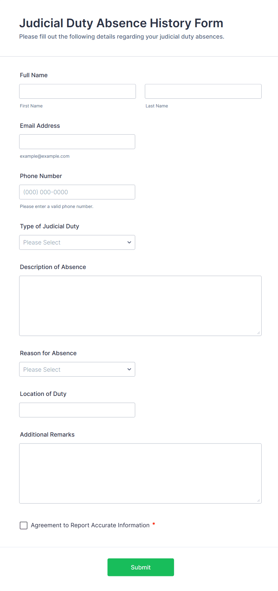 The form templates here are for informational purposes only. Jotform is not providing legal, financial, or other advice, or implying that the forms are legally valid in all or any jurisdictions. Before using any such form, consult an attorney and/or other applicable professionals to make sure that the form meets your needs, legally and otherwise.