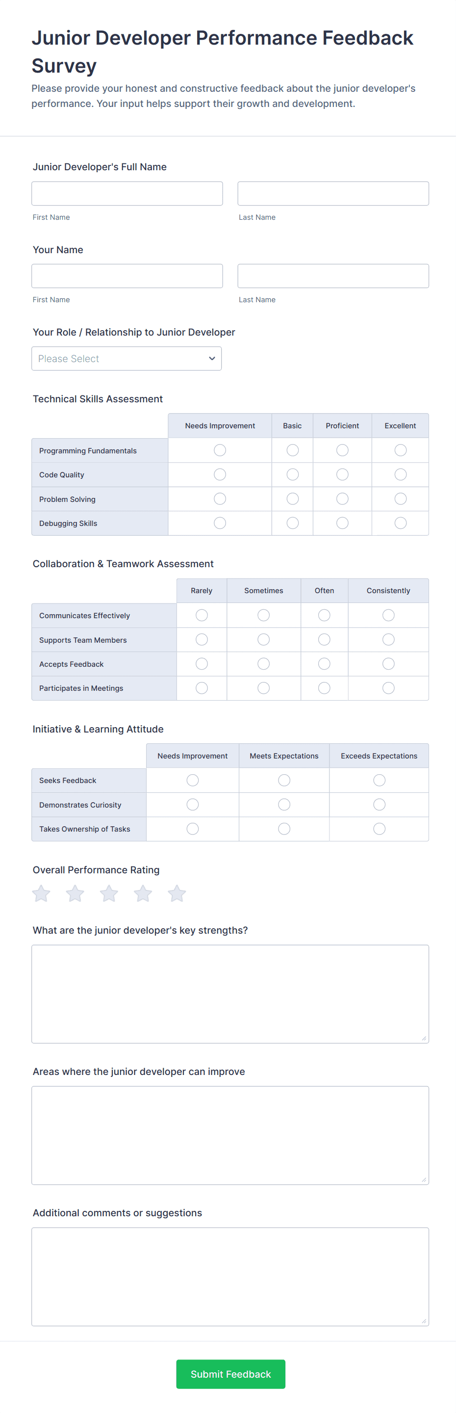 An annual peer performance evaluation form is used by a supervisor to provide feedback to their employees on their performance over a year. Boost your progress via Jotform. No coding.
