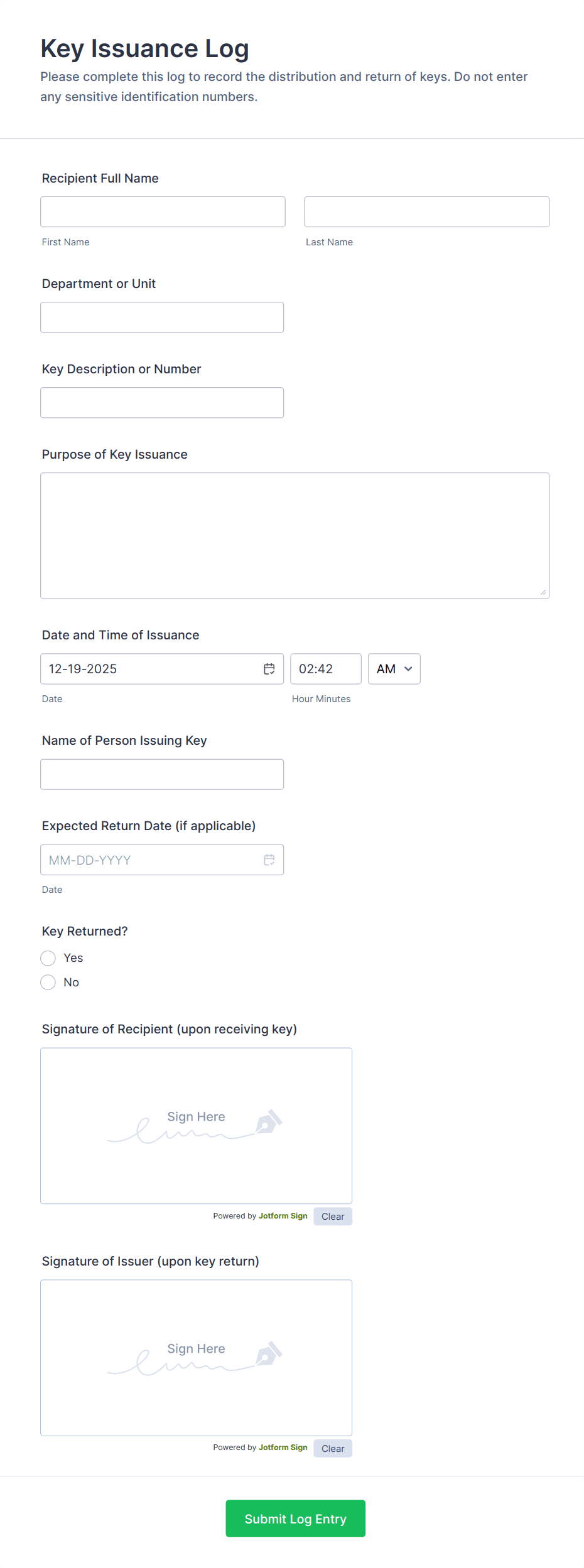 The Key Issuance Log form template from Jotform helps offices, schools, and property managers track keys issued and returned using the Jotform Form Builder no-code form builder and drag-and-drop interface for accurate data collection and form submission records.