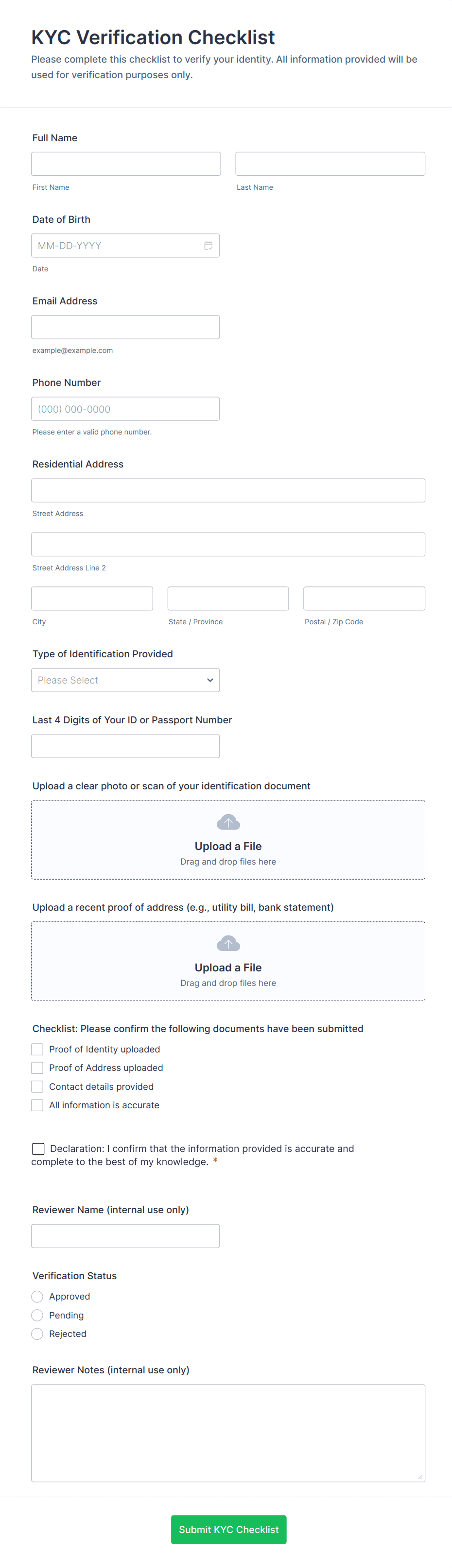 - Customer Verification (KYC): Businesses in regulated industries use Know Your Customer (KYC) forms to comply with legal requirements.