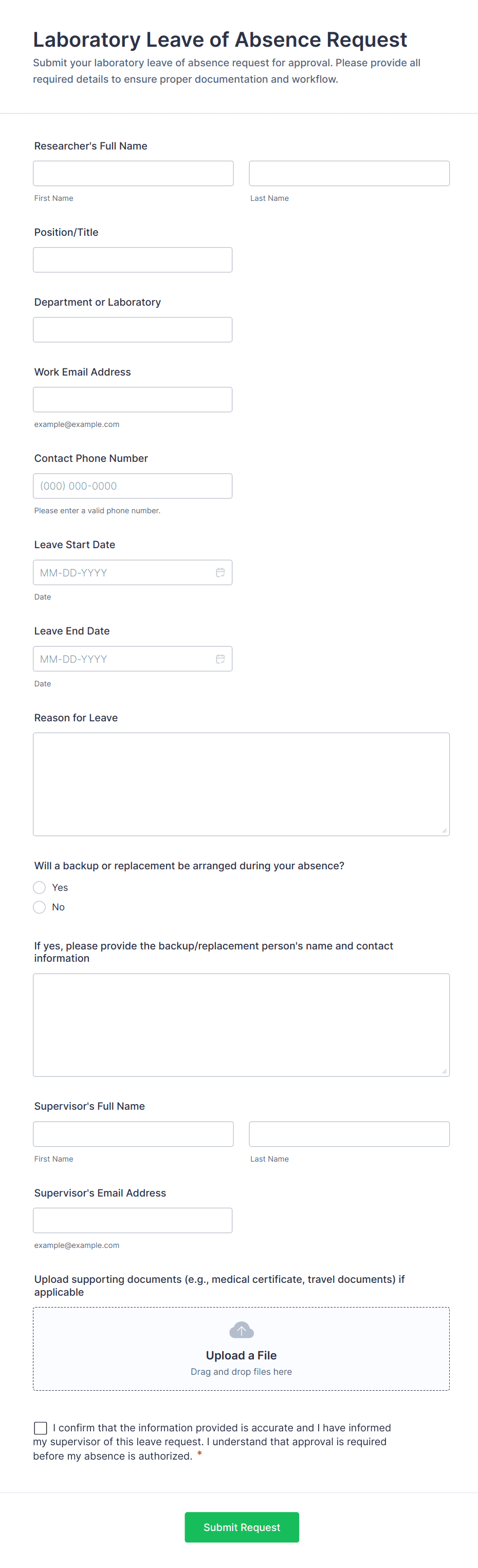 Common fields include employee name, department, type of leave, dates of absence, reason for leave, and any required supporting documentation.